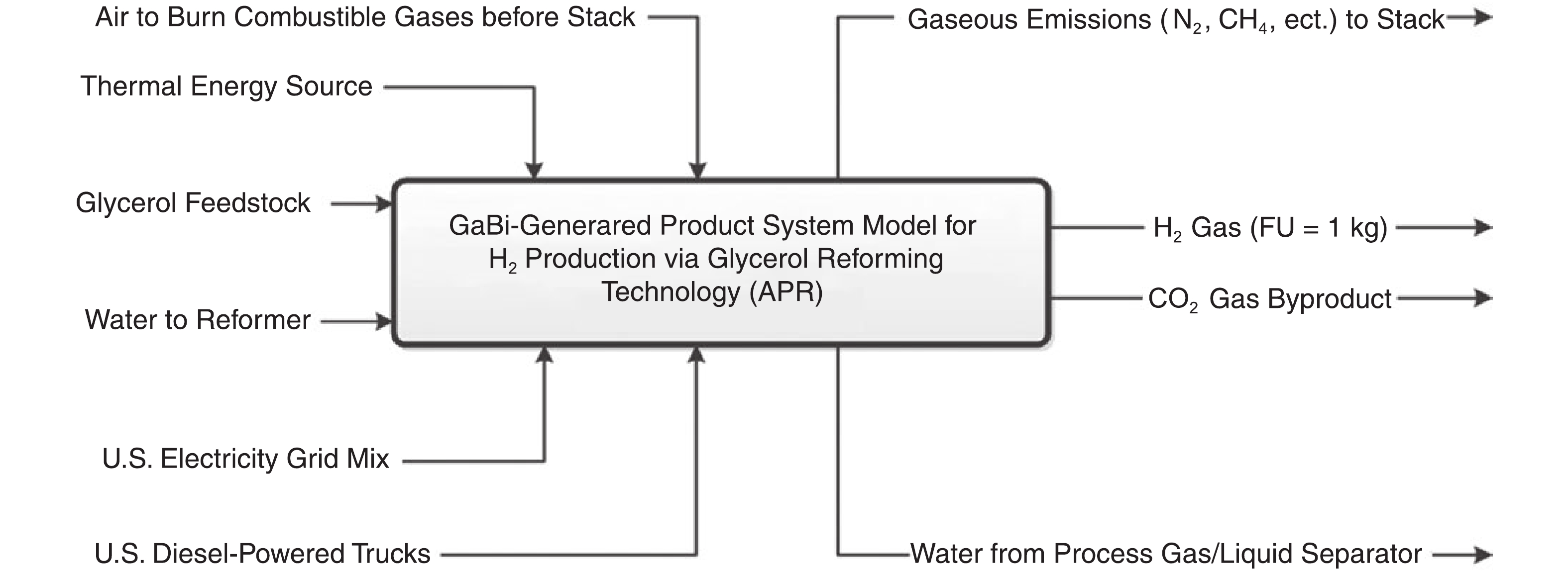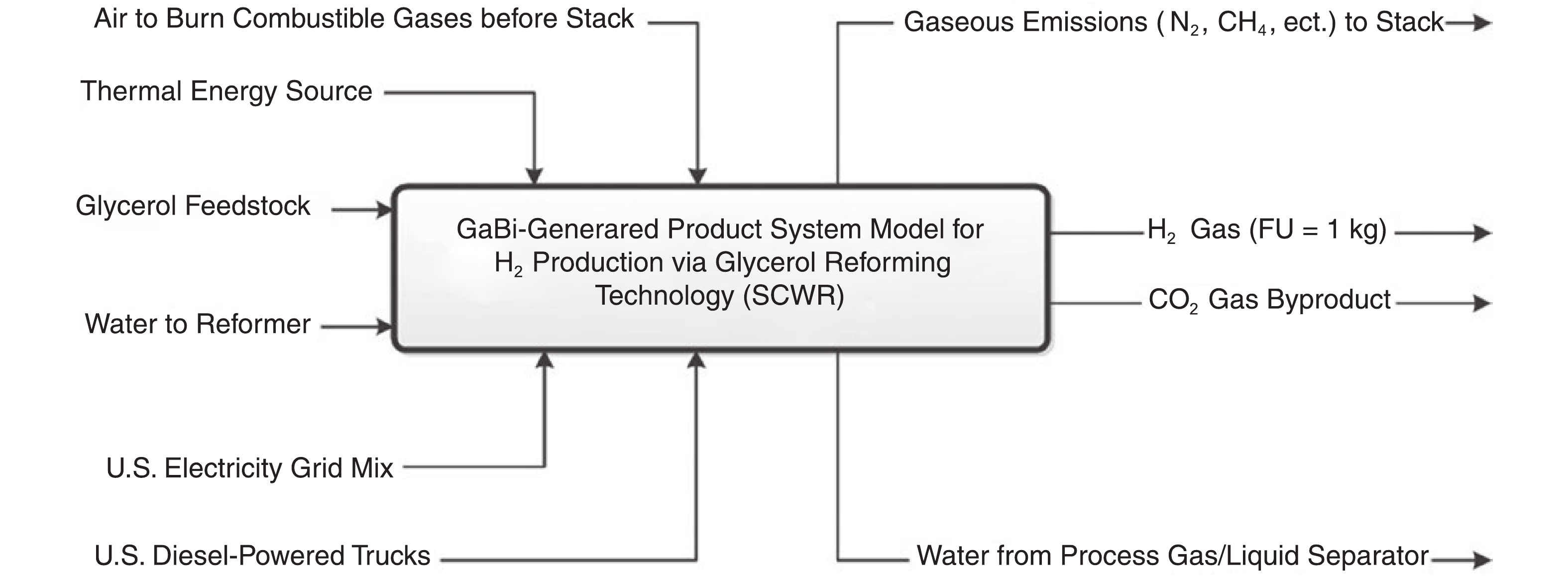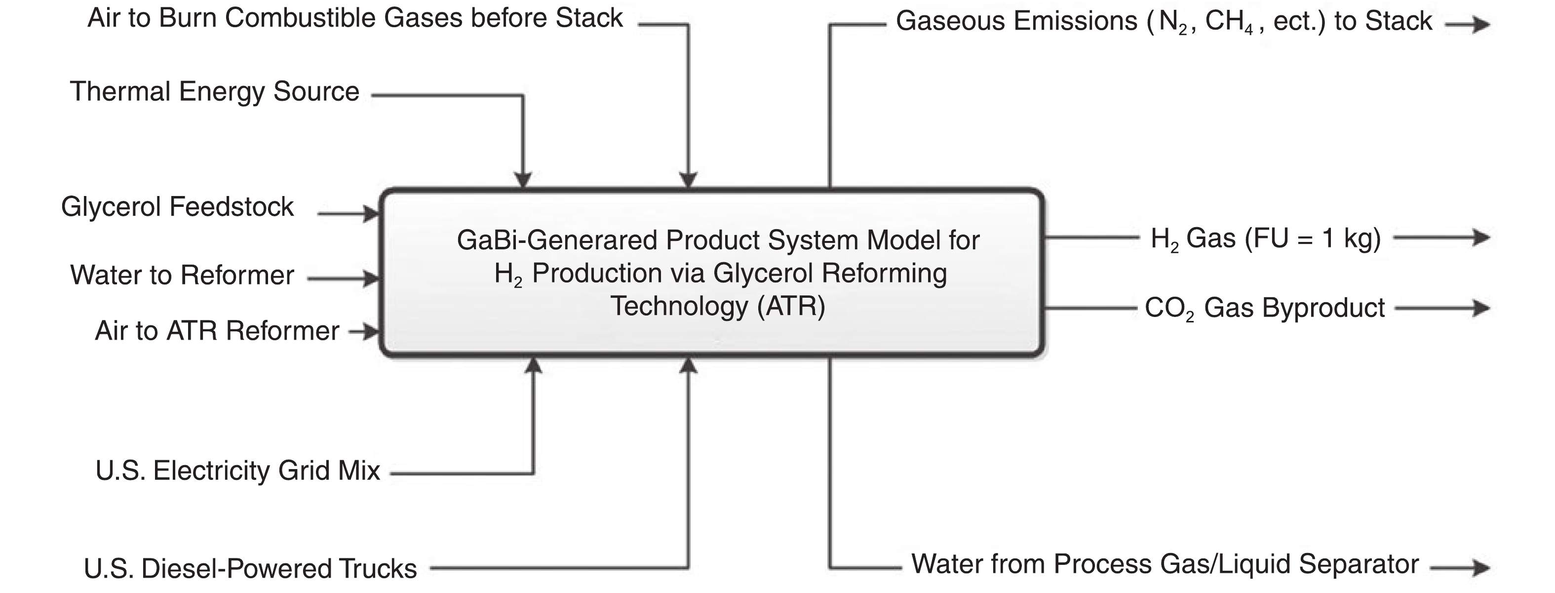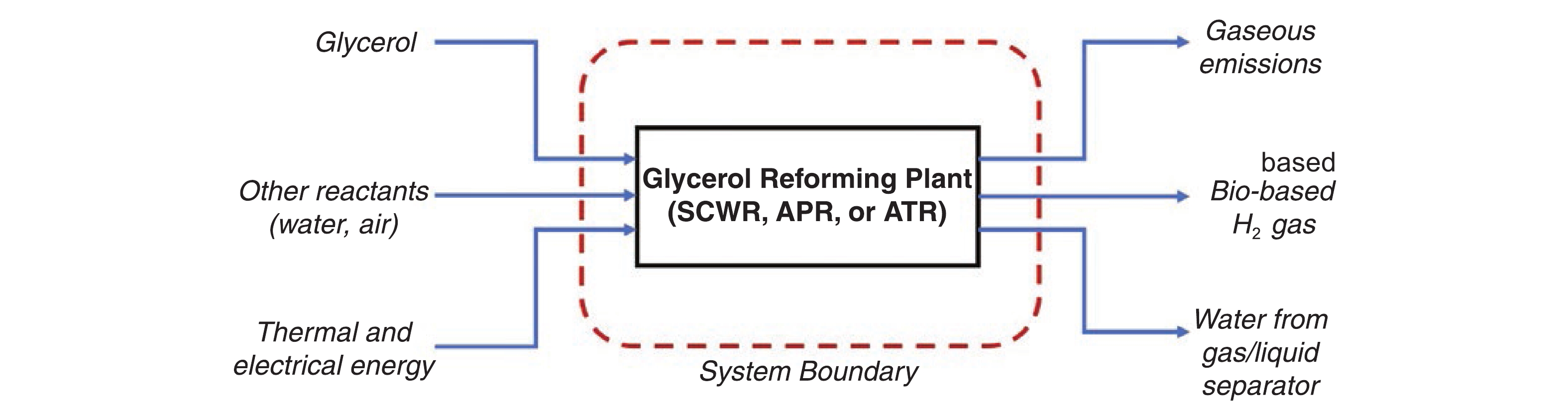 本文是一篇基于模拟的比较性评价,旨在量化某一种绿色氢气 (H2) 的生产过程对环境和人类健康的影响;氢气是通过3种基于甘油的技术而生产得到的,具体包括超临界水重整(supercritical water reforming, SCWR)、水相重整(aqueous-phase reforming, APR)和自热重整(autothermal reforming, ATR)技术。2018版的GaBi生命周期评价(life-cycle assessment, LCA)平台为这些技术发展开发了“从原材料到出厂(cradle-to-gate)”的产品系统模型,并通过TRACI 2.1方法对它们的中点影响类别进行了量化。基于上述各甘油-重整技术,使用Aspen HYSYS(v11)过程仿真软件,获得了生产1 kg H2所需的生命周期清单(life-cycle inventory, LCI)原始数据。根据ISO14040:2006对生命周期清单结果解释步骤的报告要求,开发并量化了3种基准情形(base case, BC)和4种敏感场景(sensitivity scenario, SS),并就生产过程中不同的电力(美国电网混合电力与风电)和热力来源(天然气与沼气)对生命周期评价(LCA)结果的影响进行比较。由于SCWR过程的操作压力较高(即240 bar),可以对原位(in situ)发电带来的影响进行评价,从而抵偿了这项技术所需的部分电力消耗。本研究得出的主要结论如下:(i)每生产1 kg H2,APR过程相较于ATR过程减少了约95%的CO2排放量,相较于SCWR过程则减少了约92%的排放量;(ii)在基准情形中,一次能源消耗量(按生产1 kg H2所需的MJ量计)从最高到最低依次为:ATR > SCWR > APR;(iii)通过甘油用APR过程生产H2的技术,相较于SCWR和ATR过程在环境方面更具可持续性,因此为生产更绿色的H2提供了一条更具前景的途径。未来的环境可持续性研究应侧重于拓展这项研究的范围,以纳入更多的H2生产途径,具体包括使用可再生电源开展电解水作业以及通过太阳能与核能驱动热化学水分解作业。