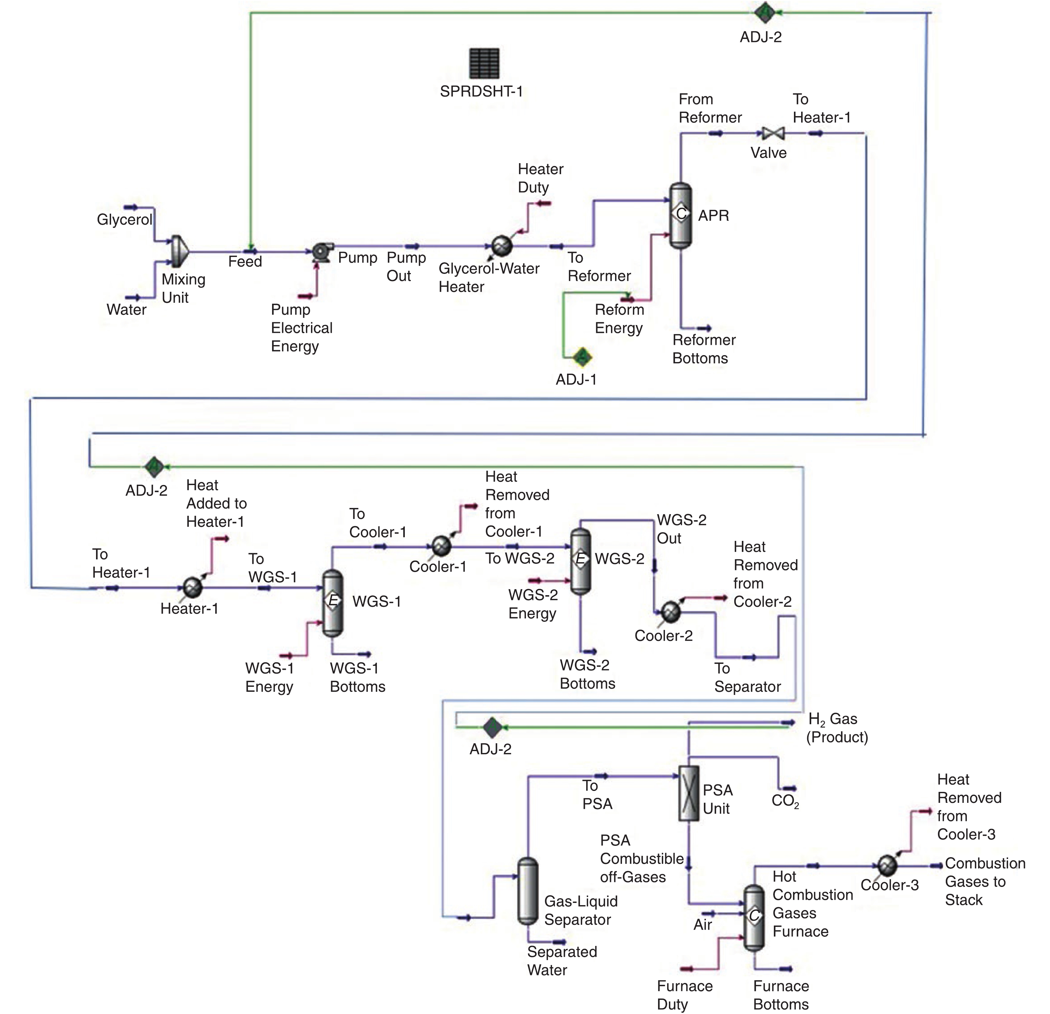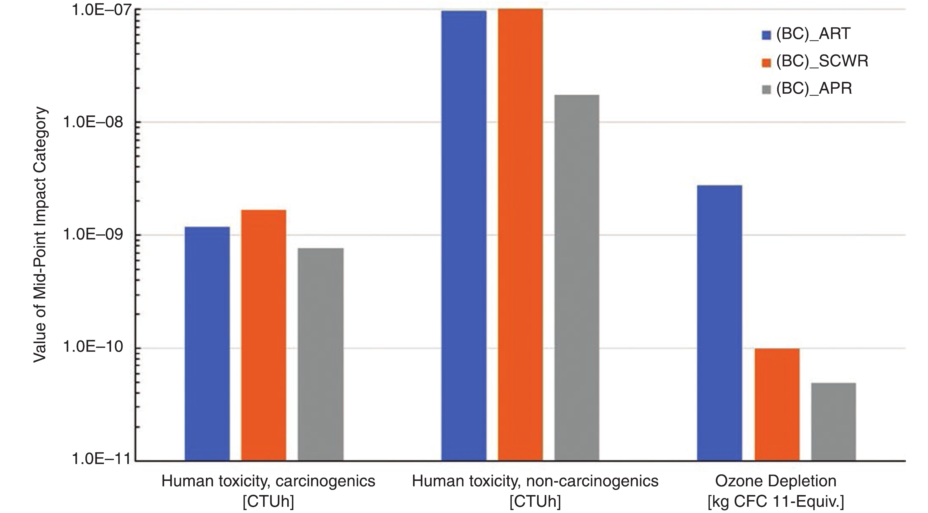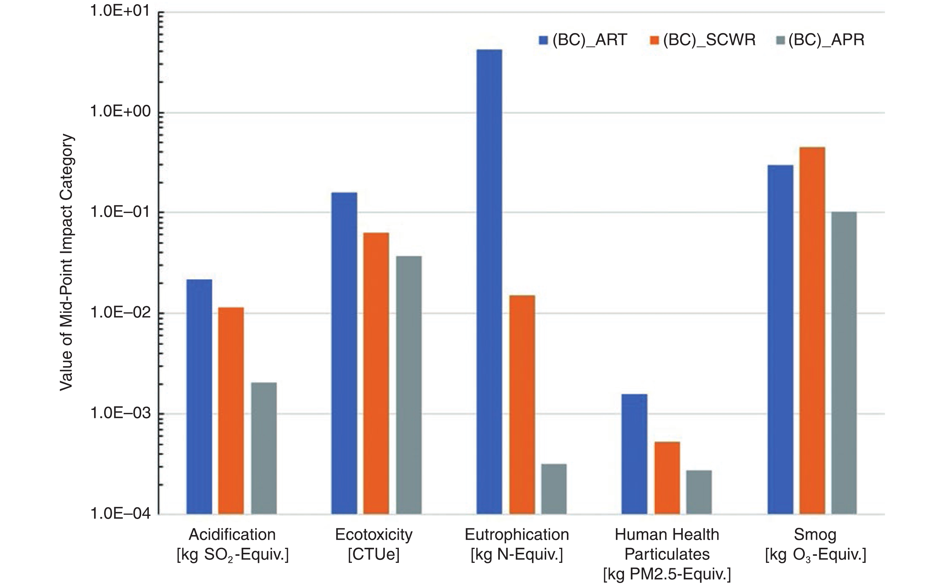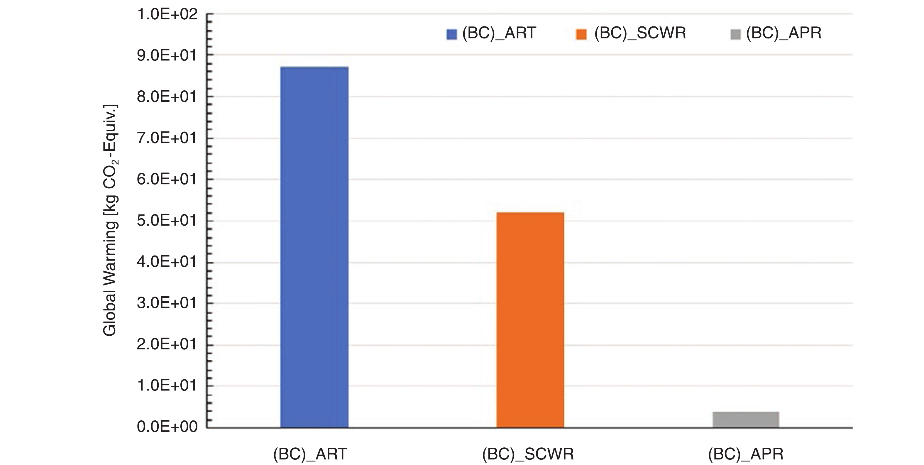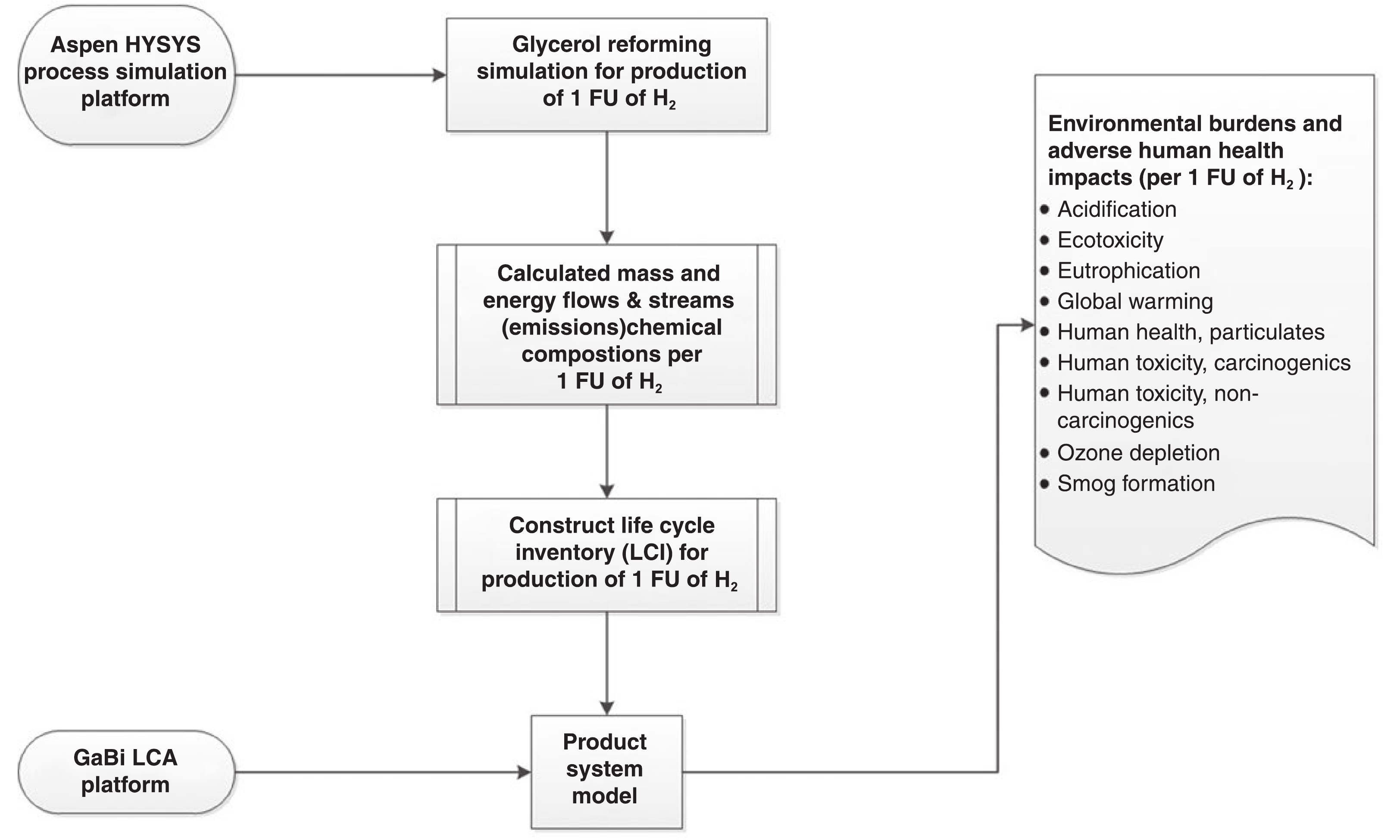 本文是一篇基于模拟的比较性评价,旨在量化某一种绿色氢气 (H2) 的生产过程对环境和人类健康的影响;氢气是通过3种基于甘油的技术而生产得到的,具体包括超临界水重整(supercritical water reforming, SCWR)、水相重整(aqueous-phase reforming, APR)和自热重整(autothermal reforming, ATR)技术。2018版的GaBi生命周期评价(life-cycle assessment, LCA)平台为这些技术发展开发了“从原材料到出厂(cradle-to-gate)”的产品系统模型,并通过TRACI 2.1方法对它们的中点影响类别进行了量化。基于上述各甘油-重整技术,使用Aspen HYSYS(v11)过程仿真软件,获得了生产1 kg H2所需的生命周期清单(life-cycle inventory, LCI)原始数据。根据ISO14040:2006对生命周期清单结果解释步骤的报告要求,开发并量化了3种基准情形(base case, BC)和4种敏感场景(sensitivity scenario, SS),并就生产过程中不同的电力(美国电网混合电力与风电)和热力来源(天然气与沼气)对生命周期评价(LCA)结果的影响进行比较。由于SCWR过程的操作压力较高(即240 bar),可以对原位(in situ)发电带来的影响进行评价,从而抵偿了这项技术所需的部分电力消耗。本研究得出的主要结论如下:(i)每生产1 kg H2,APR过程相较于ATR过程减少了约95%的CO2排放量,相较于SCWR过程则减少了约92%的排放量;(ii)在基准情形中,一次能源消耗量(按生产1 kg H2所需的MJ量计)从最高到最低依次为:ATR > SCWR > APR;(iii)通过甘油用APR过程生产H2的技术,相较于SCWR和ATR过程在环境方面更具可持续性,因此为生产更绿色的H2提供了一条更具前景的途径。未来的环境可持续性研究应侧重于拓展这项研究的范围,以纳入更多的H2生产途径,具体包括使用可再生电源开展电解水作业以及通过太阳能与核能驱动热化学水分解作业。