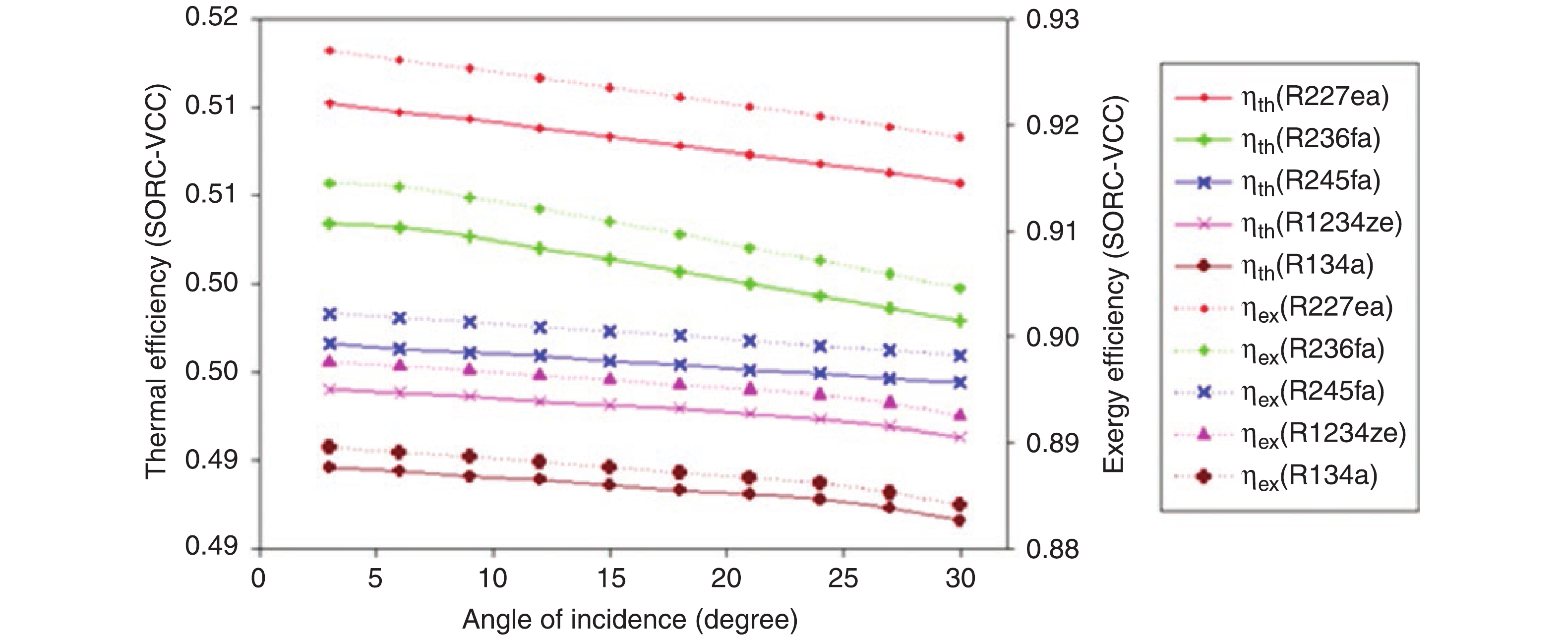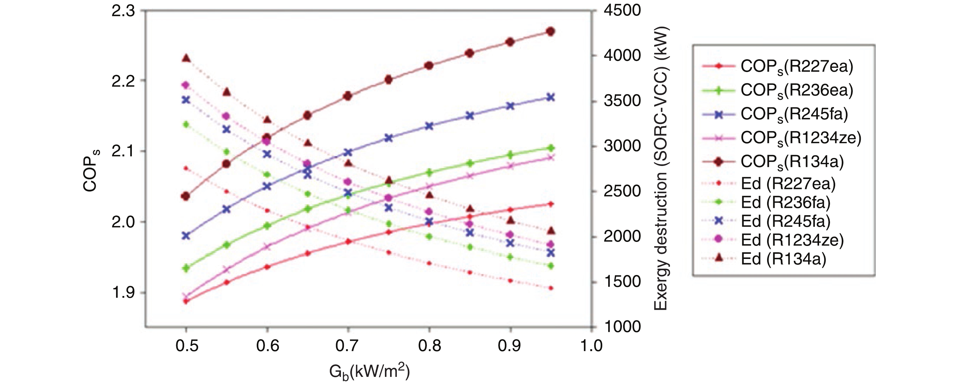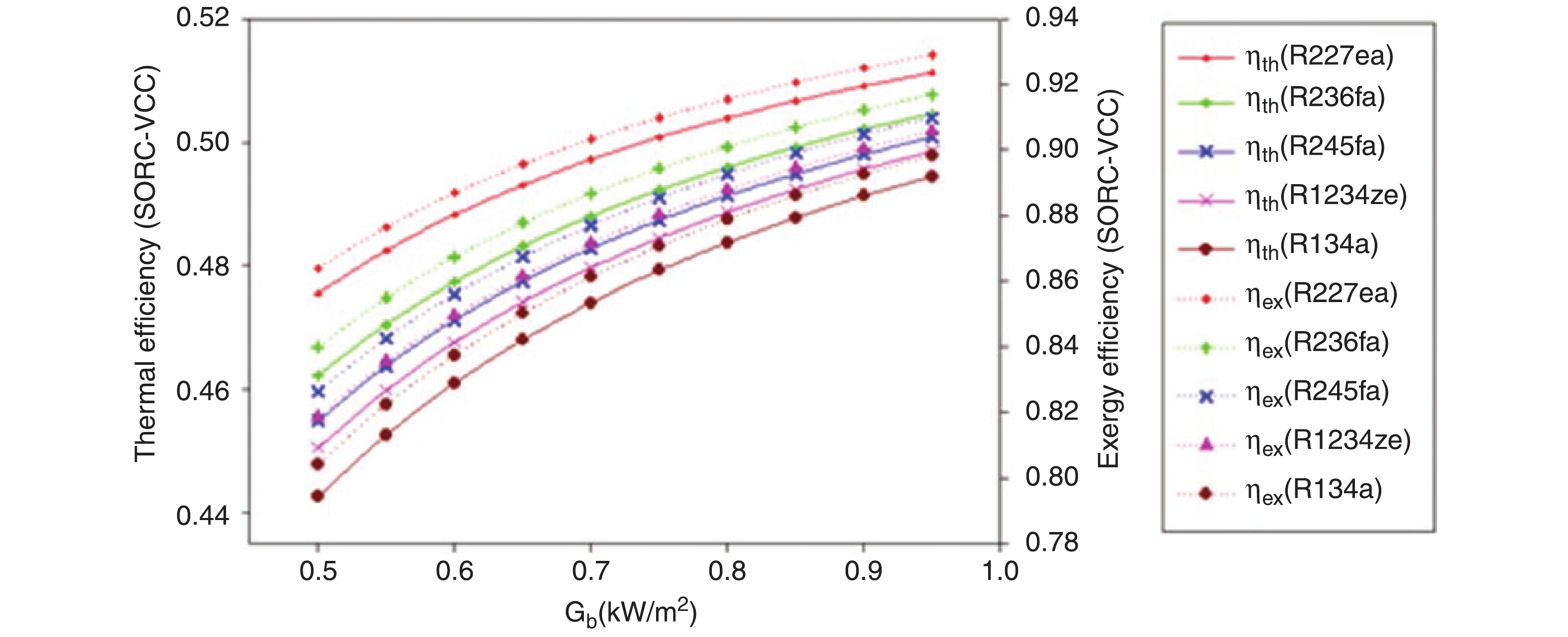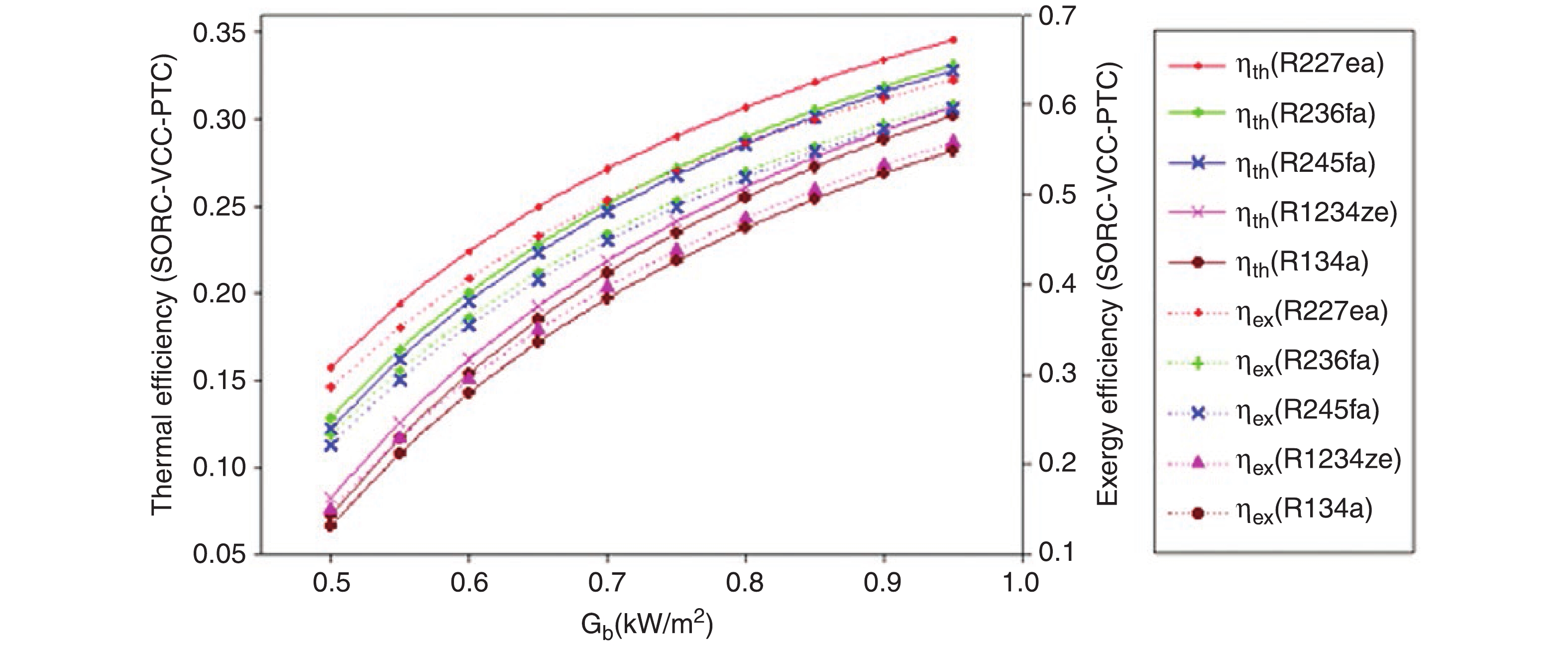 本文对抛物面槽式太阳能集热器(parabolic trough collectors,PTCs)驱动的超临界有机朗肯循环与蒸汽压缩制冷循环耦合构成的冷电联合供能系统进行了参数分析。分析参数主要包括热效率、㶲效率、㶲损和系统性能系数,参数分析过程由一套新开发的工程方程求解计算程序实现。通过分析,讨论了PTCs设计参数(如太阳辐射、太阳光束入射角和吸收管内传热流体速度)、涡轮进口压力、冷凝器和蒸发器温度对联供系统性能的影响。此外,还对联供系统耦合和未耦合PTCs的工况进行了系统性能对比。在太阳辐射强度为0.95 kW/m2的工况下,该联供系统(循环工质为R227ea)的最大㶲效率、热效率和㶲损分别为92.9%、51.13%和1437 kW;若采用R134a做循环工质,联供系统的最大性能系数为2.278。分析结果还表明:PTCs的㶲损占整个系统的76.32%,在不考虑太阳能性能的情况下,联供系统的性能表现良好。