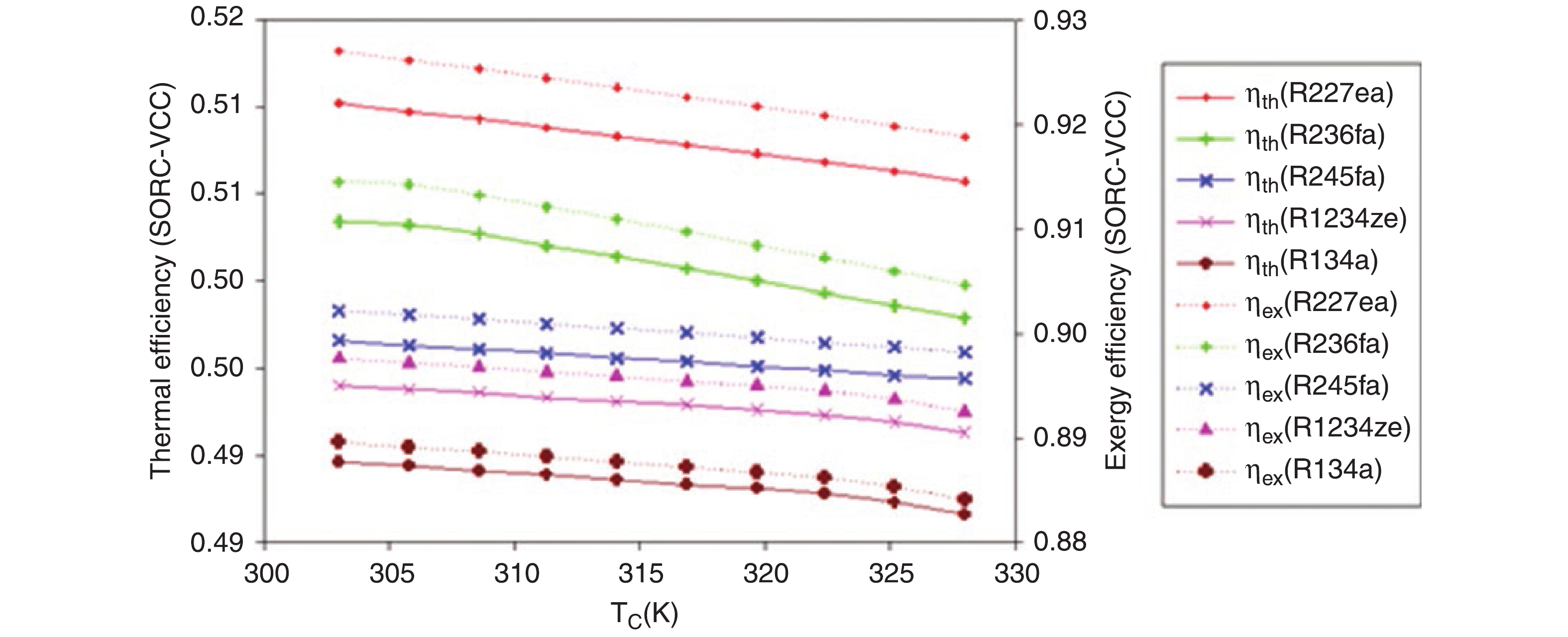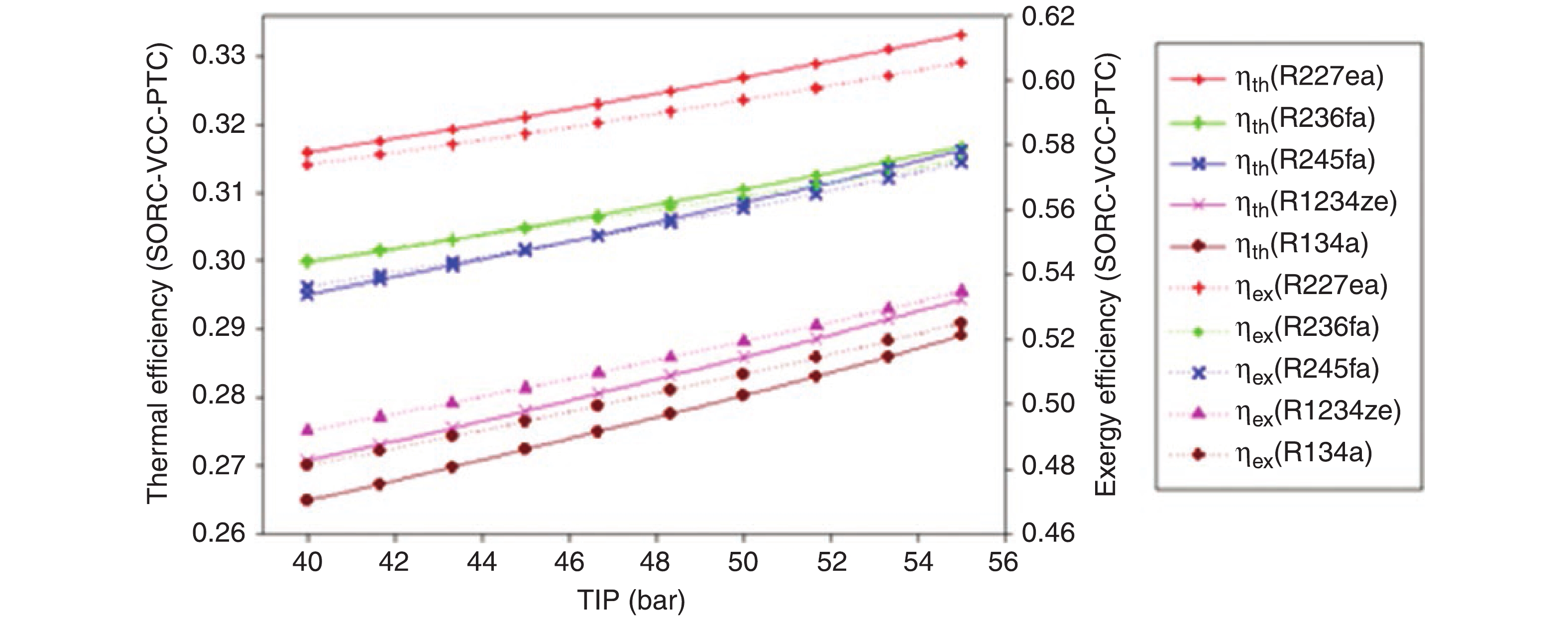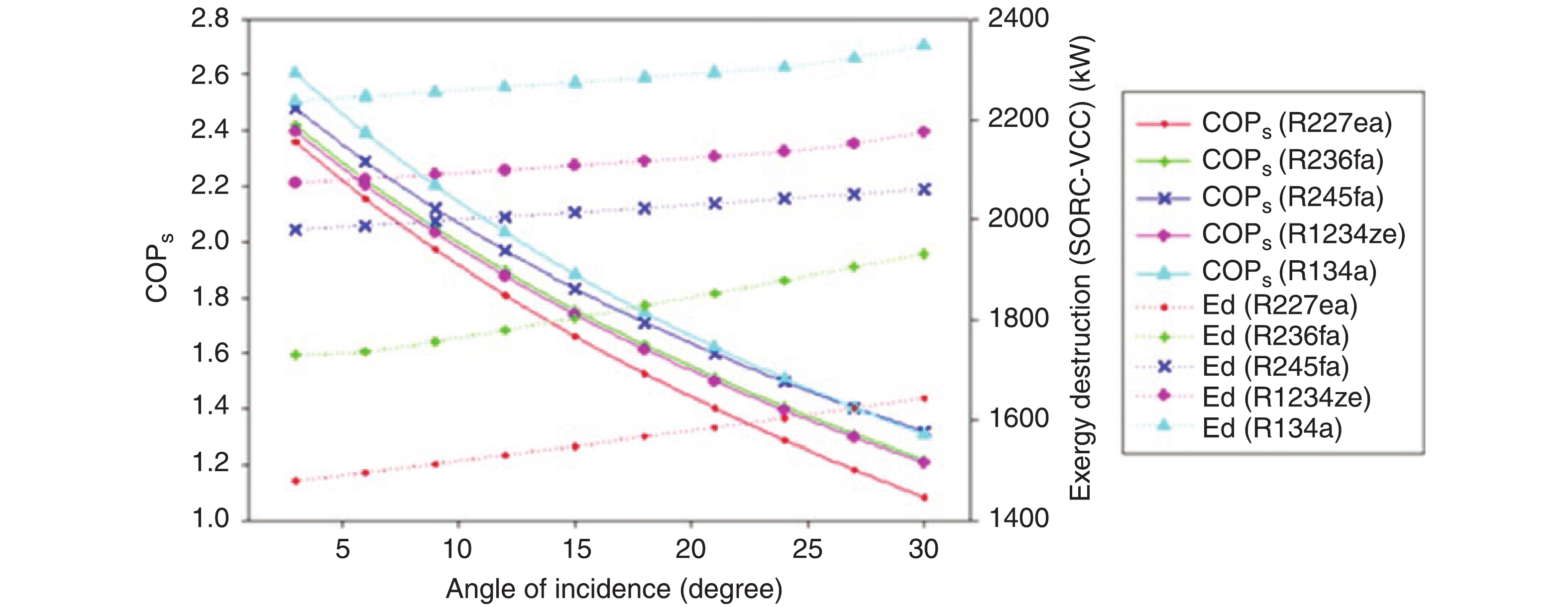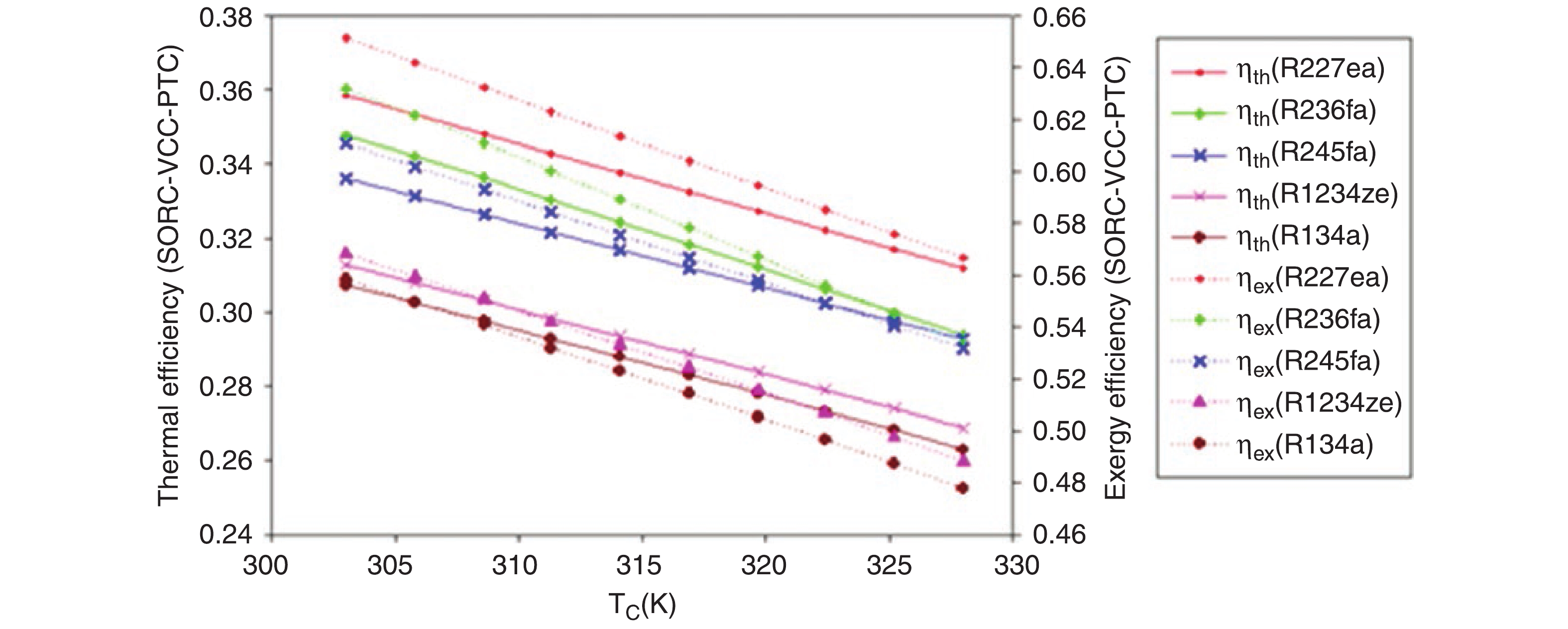 本文对抛物面槽式太阳能集热器(parabolic trough collectors,PTCs)驱动的超临界有机朗肯循环与蒸汽压缩制冷循环耦合构成的冷电联合供能系统进行了参数分析。分析参数主要包括热效率、㶲效率、㶲损和系统性能系数,参数分析过程由一套新开发的工程方程求解计算程序实现。通过分析,讨论了PTCs设计参数(如太阳辐射、太阳光束入射角和吸收管内传热流体速度)、涡轮进口压力、冷凝器和蒸发器温度对联供系统性能的影响。此外,还对联供系统耦合和未耦合PTCs的工况进行了系统性能对比。在太阳辐射强度为0.95 kW/m2的工况下,该联供系统(循环工质为R227ea)的最大㶲效率、热效率和㶲损分别为92.9%、51.13%和1437 kW;若采用R134a做循环工质,联供系统的最大性能系数为2.278。分析结果还表明:PTCs的㶲损占整个系统的76.32%,在不考虑太阳能性能的情况下,联供系统的性能表现良好。