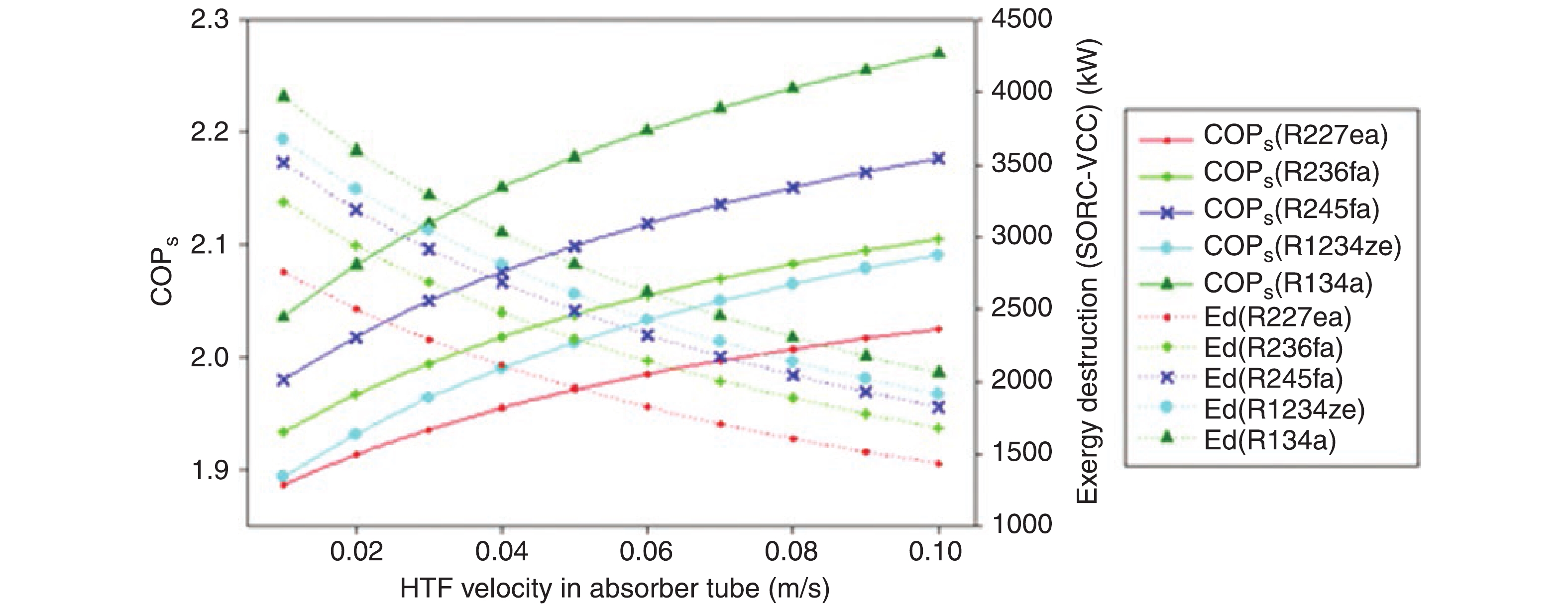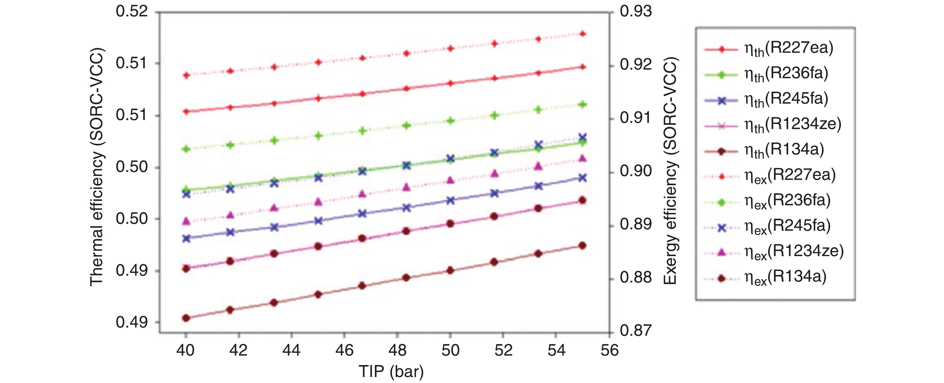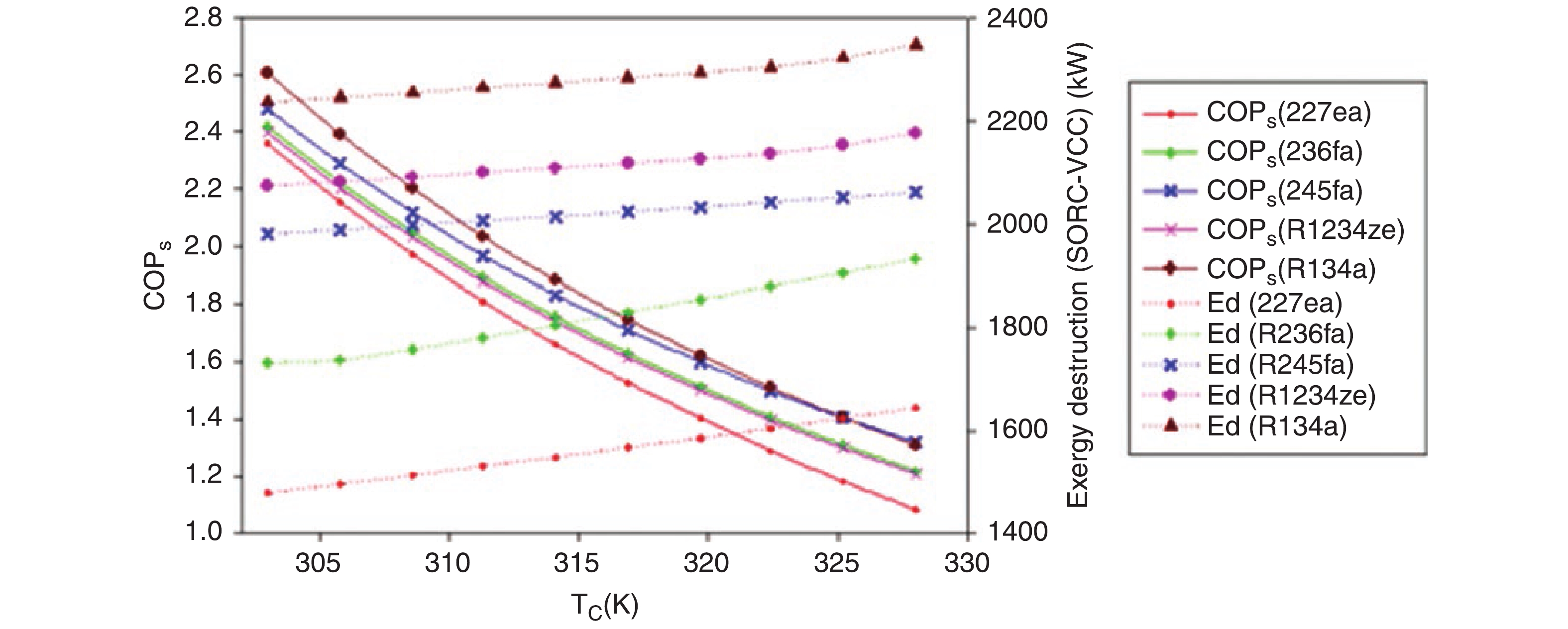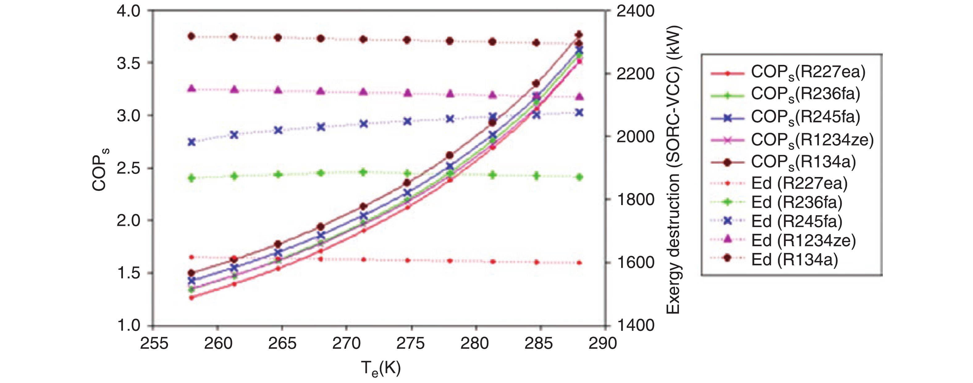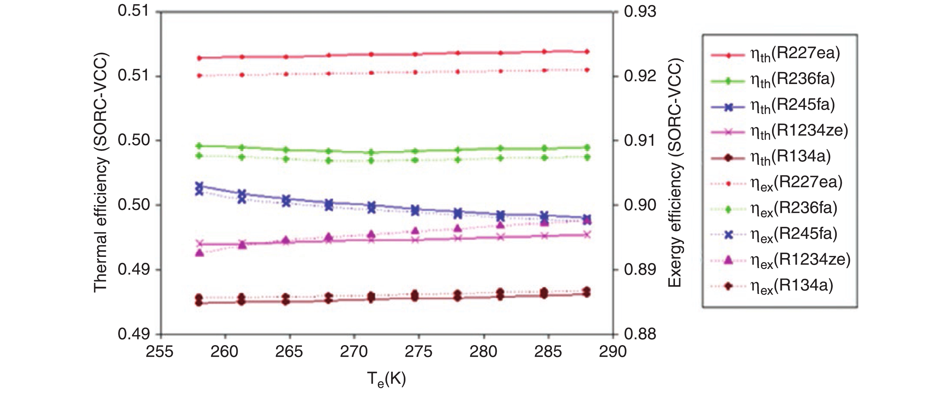 本文对抛物面槽式太阳能集热器(parabolic trough collectors,PTCs)驱动的超临界有机朗肯循环与蒸汽压缩制冷循环耦合构成的冷电联合供能系统进行了参数分析。分析参数主要包括热效率、㶲效率、㶲损和系统性能系数,参数分析过程由一套新开发的工程方程求解计算程序实现。通过分析,讨论了PTCs设计参数(如太阳辐射、太阳光束入射角和吸收管内传热流体速度)、涡轮进口压力、冷凝器和蒸发器温度对联供系统性能的影响。此外,还对联供系统耦合和未耦合PTCs的工况进行了系统性能对比。在太阳辐射强度为0.95 kW/m2的工况下,该联供系统(循环工质为R227ea)的最大㶲效率、热效率和㶲损分别为92.9%、51.13%和1437 kW;若采用R134a做循环工质,联供系统的最大性能系数为2.278。分析结果还表明:PTCs的㶲损占整个系统的76.32%,在不考虑太阳能性能的情况下,联供系统的性能表现良好。