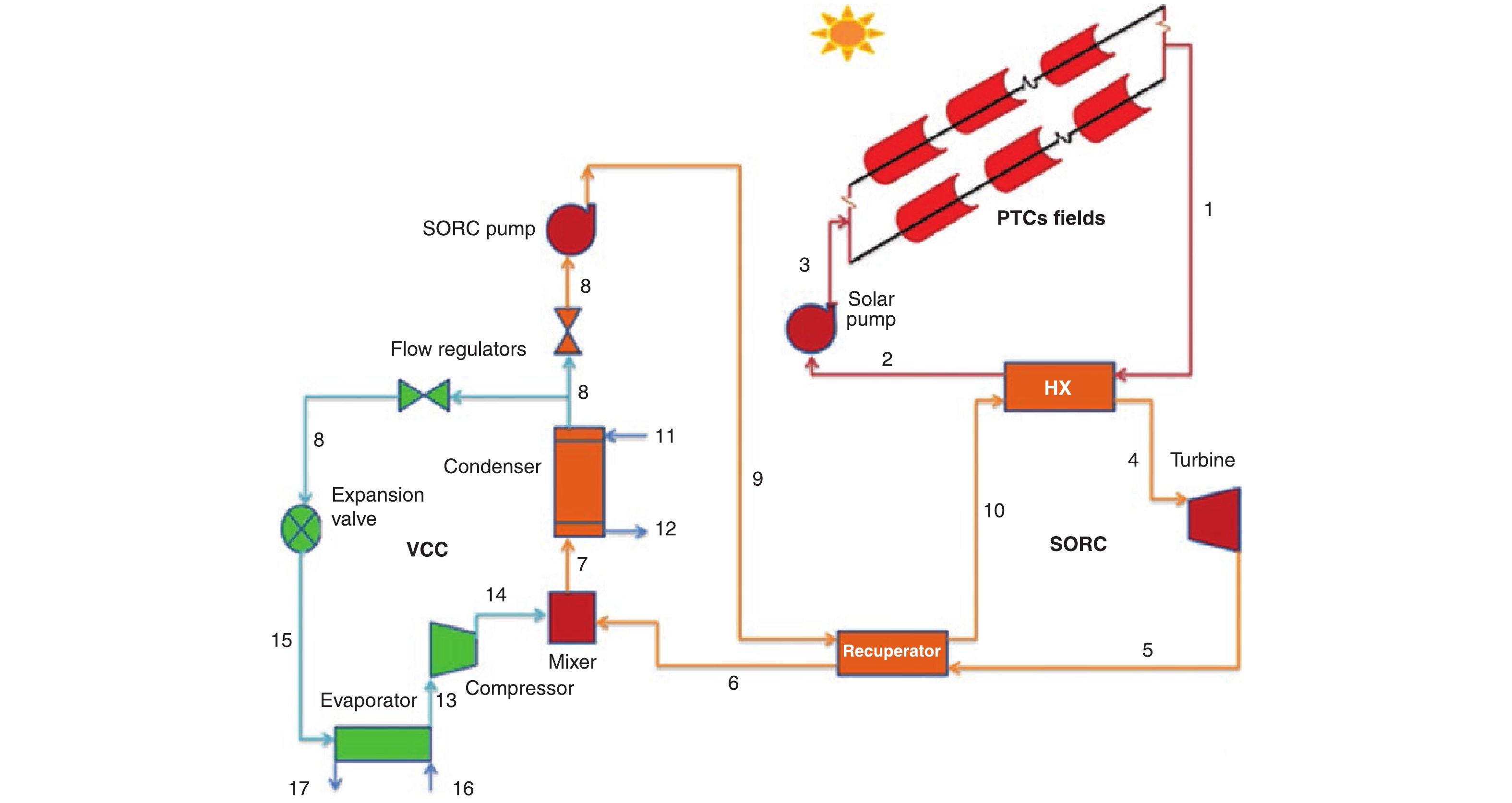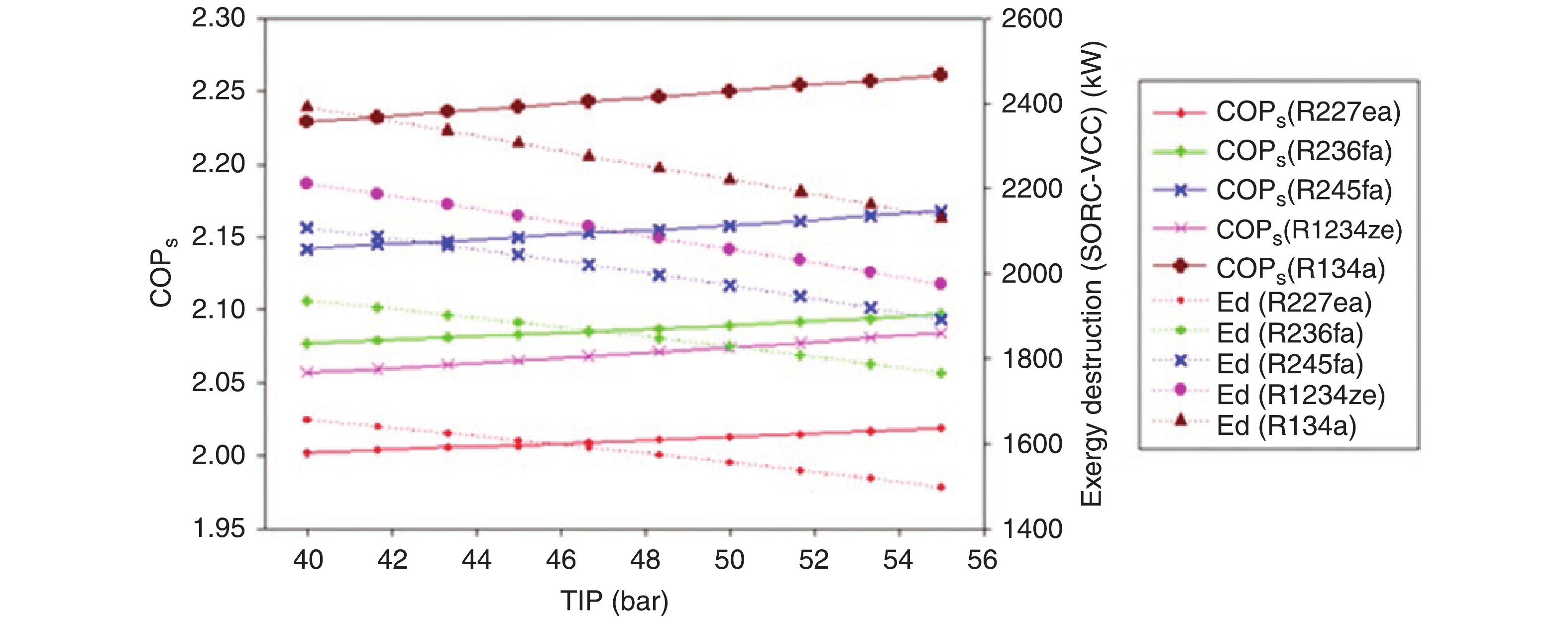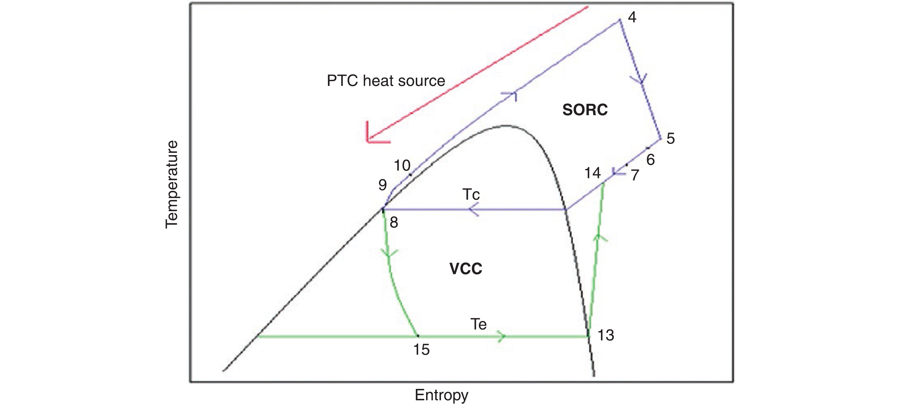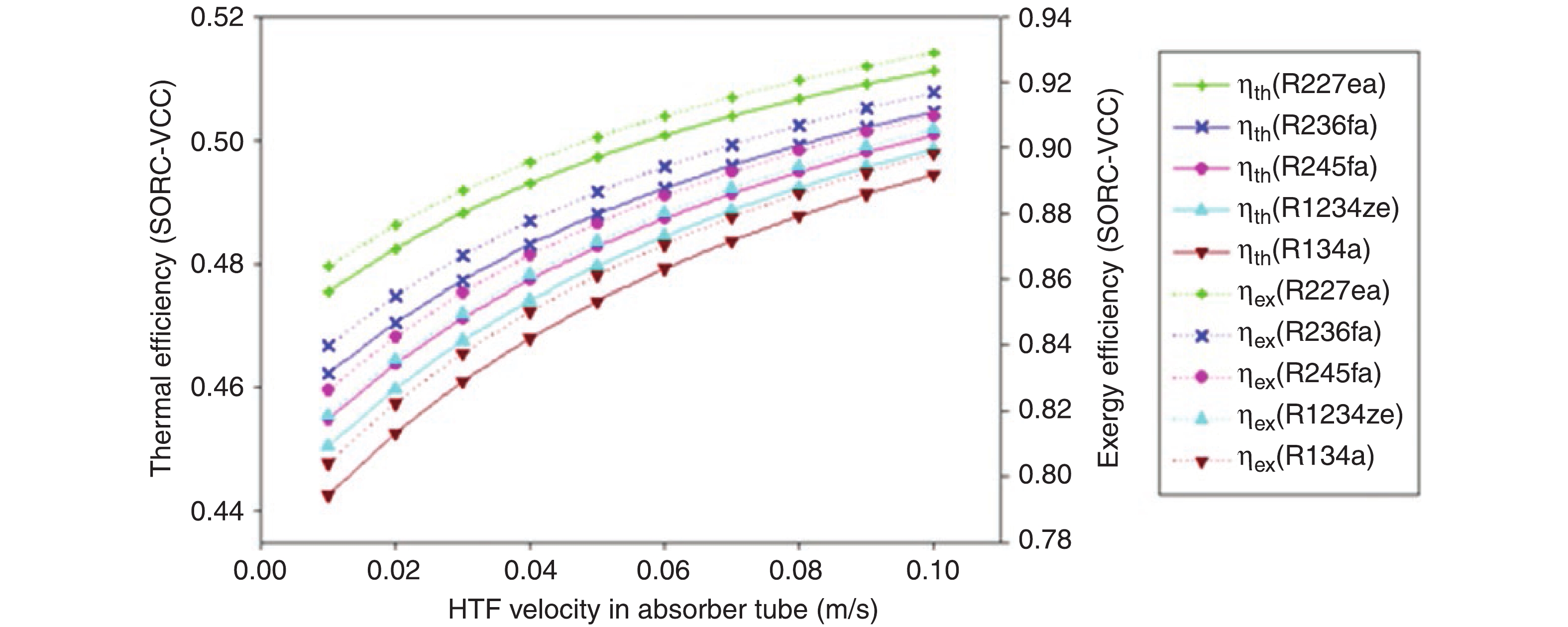 本文对抛物面槽式太阳能集热器(parabolic trough collectors,PTCs)驱动的超临界有机朗肯循环与蒸汽压缩制冷循环耦合构成的冷电联合供能系统进行了参数分析。分析参数主要包括热效率、㶲效率、㶲损和系统性能系数,参数分析过程由一套新开发的工程方程求解计算程序实现。通过分析,讨论了PTCs设计参数(如太阳辐射、太阳光束入射角和吸收管内传热流体速度)、涡轮进口压力、冷凝器和蒸发器温度对联供系统性能的影响。此外,还对联供系统耦合和未耦合PTCs的工况进行了系统性能对比。在太阳辐射强度为0.95 kW/m2的工况下,该联供系统(循环工质为R227ea)的最大㶲效率、热效率和㶲损分别为92.9%、51.13%和1437 kW;若采用R134a做循环工质,联供系统的最大性能系数为2.278。分析结果还表明:PTCs的㶲损占整个系统的76.32%,在不考虑太阳能性能的情况下,联供系统的性能表现良好。