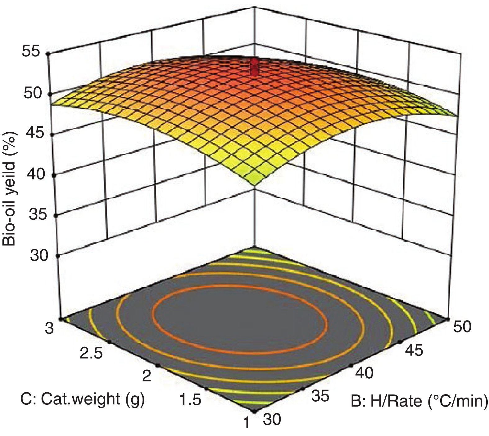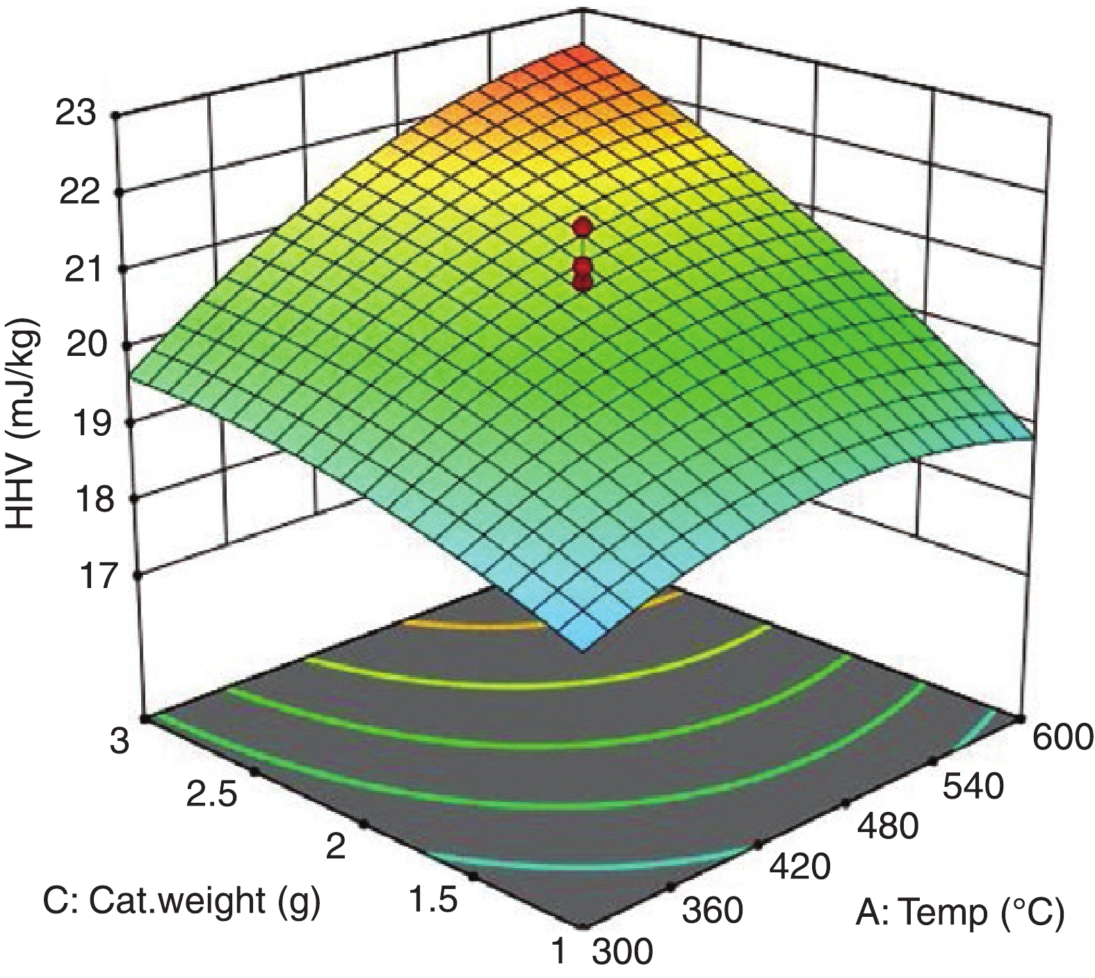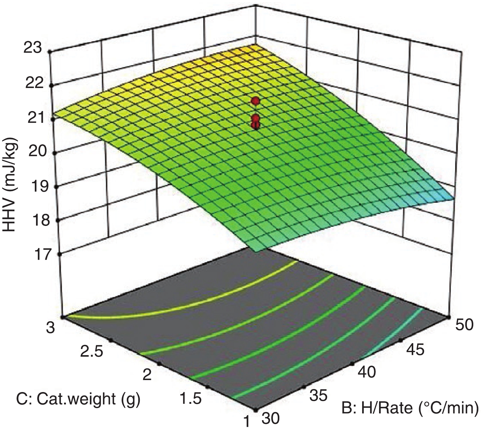 鉴于生物油产率低,燃料特性差,故以热解生产并不经济,且应用亦受限制。欲生产出高质量无需过多升级处理的生物油,正确操作热解变量是关键。本文选用龟壳煅烧而得的氧化钙为催化剂,于固定床反应器上热解猪毛。热解时,用响应面分析法研究了三变量(温度、加热速率及催化剂重量)对两响应(生物油产量、高热值(HHV))的影响。本文业已得出各响应的二阶回归模型方程。当热解温度为545 ℃,加热速率为45.17 ℃/min,催化剂重量为2.504 g时,可得生物油的最佳两响应:产量为51.03%,HHV为21.87 mJ/kg。用方差分析计算得出模型中生物油产量的R2值及HHV的R2值,二者分别为0.9859、0.9527,这表明该模型足以预测热解时的生物油产量及HHV。