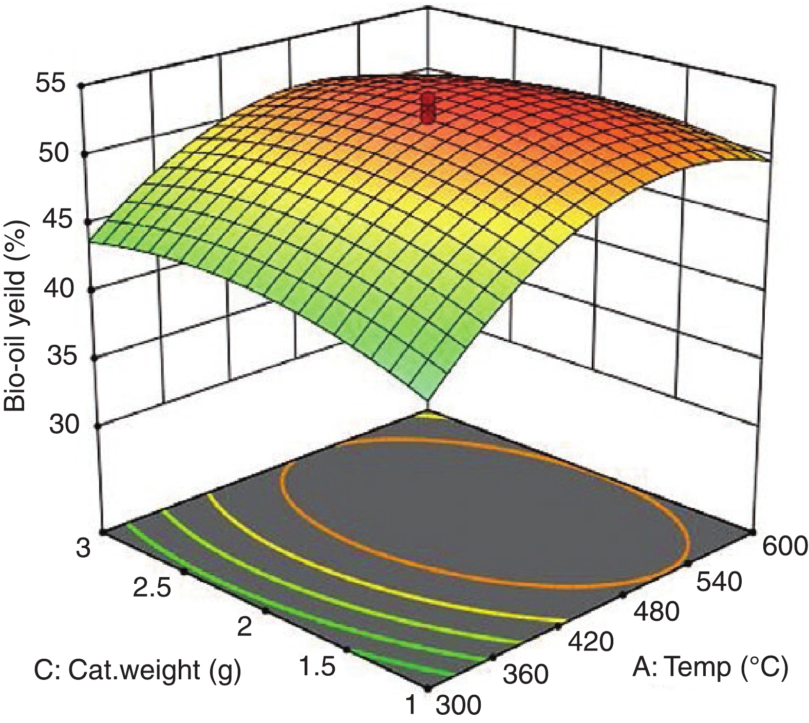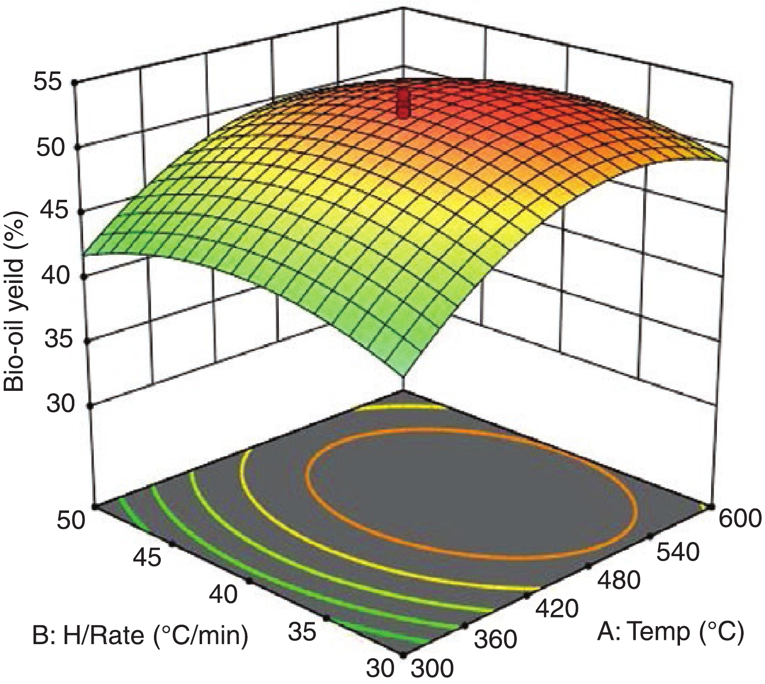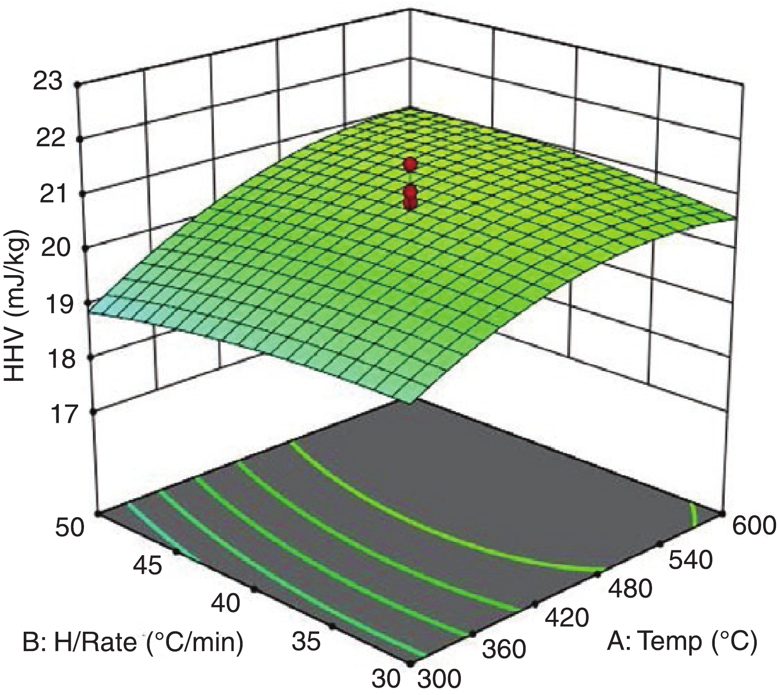 鉴于生物油产率低,燃料特性差,故以热解生产并不经济,且应用亦受限制。欲生产出高质量无需过多升级处理的生物油,正确操作热解变量是关键。本文选用龟壳煅烧而得的氧化钙为催化剂,于固定床反应器上热解猪毛。热解时,用响应面分析法研究了三变量(温度、加热速率及催化剂重量)对两响应(生物油产量、高热值(HHV))的影响。本文业已得出各响应的二阶回归模型方程。当热解温度为545 ℃,加热速率为45.17 ℃/min,催化剂重量为2.504 g时,可得生物油的最佳两响应:产量为51.03%,HHV为21.87 mJ/kg。用方差分析计算得出模型中生物油产量的R2值及HHV的R2值,二者分别为0.9859、0.9527,这表明该模型足以预测热解时的生物油产量及HHV。