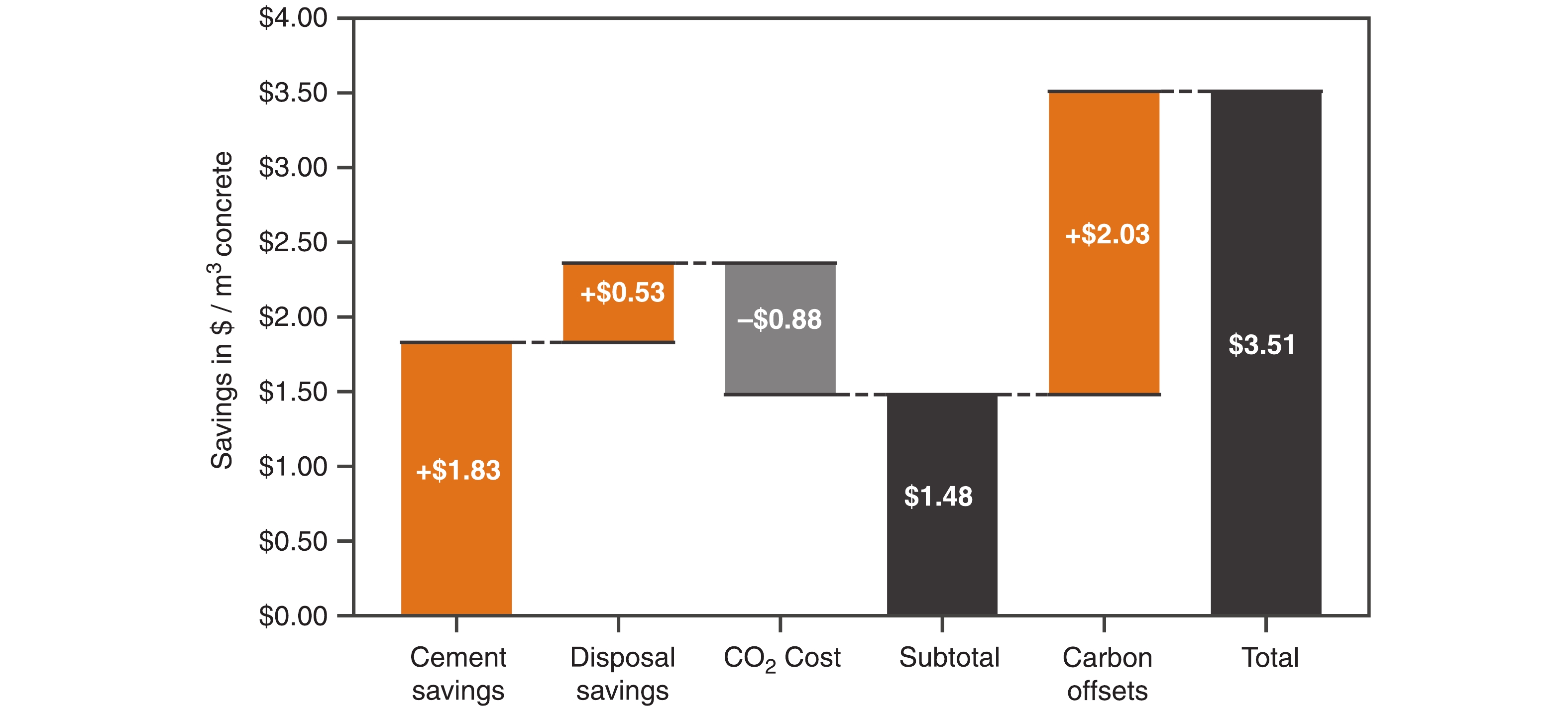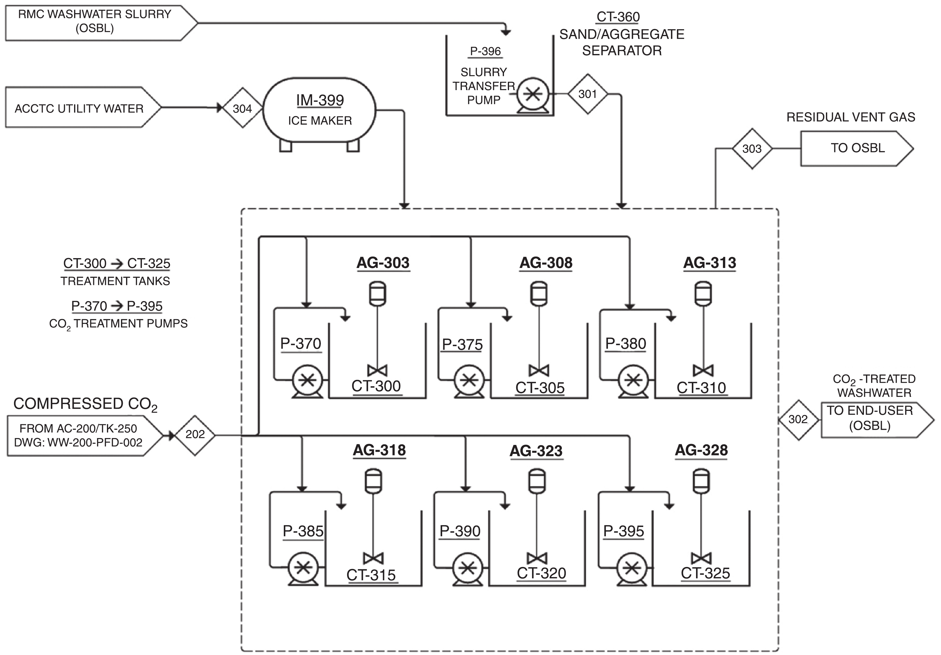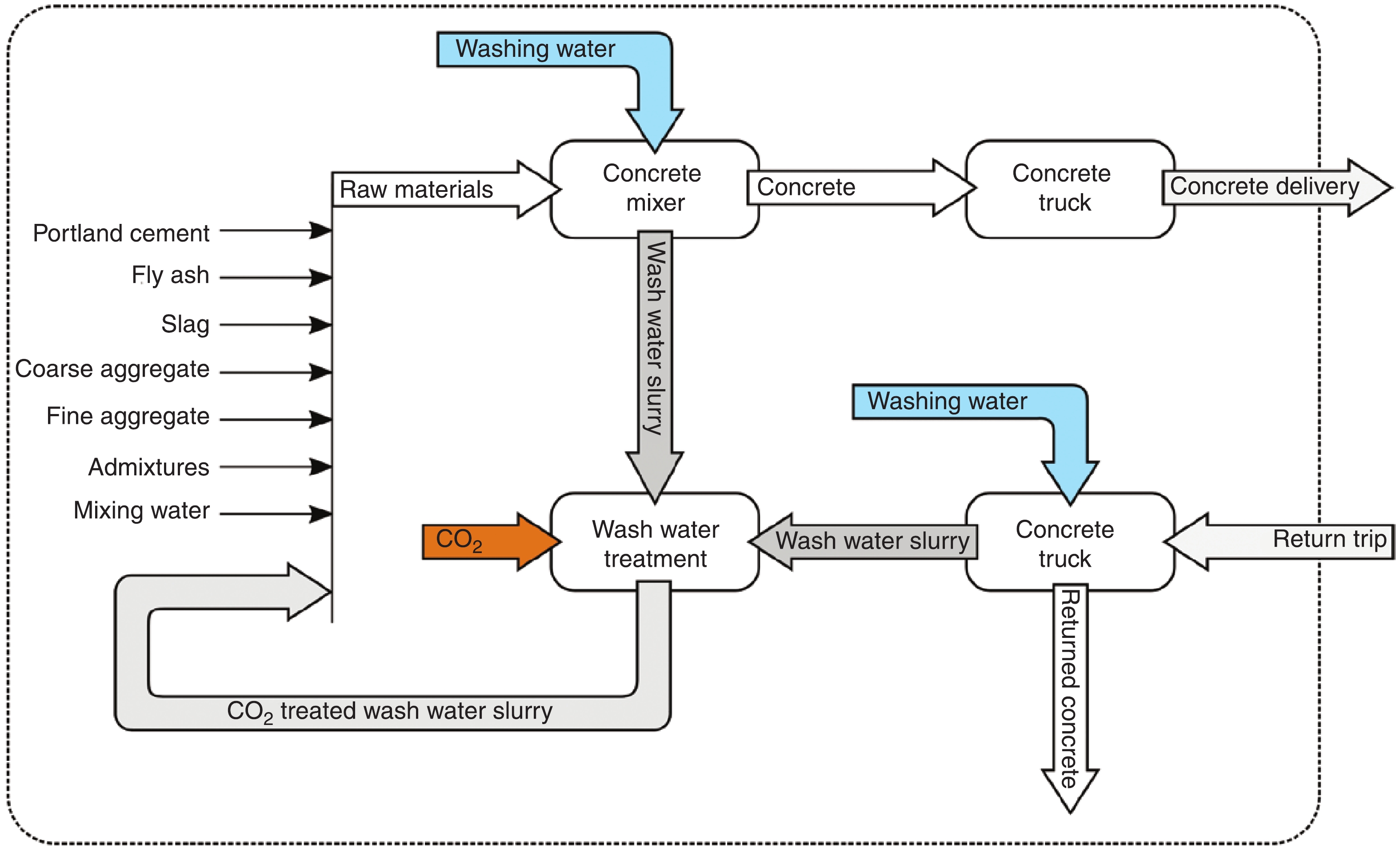 清洗水是作为预拌混凝土生产过程中的废物流而产生的。在实践中,在与这种水的化学过程和性质相关的不利材料性能的影响下,清洗水作为混合水的再利用受到了限制;随着悬浮物含量的增加和时间的延长,这种影响将会加剧。然而,如果可以降低其变化性,则可利用悬浮固体的胶凝特性,将这种废料用作混凝土的有益添加剂。稳定这种材料的一种方法是运用CO2处理,添加的CO2通过与水泥颗粒中的钙发生反应而矿化,形成了一种碳酸钙涂层,防止水泥进一步水合,使材料变得稳定可测。这种方法已被证明可以缓解设定加速度和抗压强度不一致的问题。作为NRG COSIA Carbon XPRIZE参赛项目的一部分,一种CO2处理方法在阿尔伯塔省卡尔加里(Calgary, Alberta)的某一场地中进行了测试。用于处理的浆液由当地混凝土厂提供,密度为1.15。每次处理的模拟清洗水用量为1000 L,平均矿化40 kg CO2。该系统运行1600 h经历了127个处理循环,一共转化了14.5 t CO2,平均矿化效率为80%。处理后的浆液作为添加剂可用于300个批次以上混凝土,使混凝土满足新特性和凝结时间的必要要求,同时获得了其强度效益。用处理过的浆液代替5%和10%的配料水(9.4和18.8 kg浆液/m3混凝土),与参考值相比,强度效益分别为3%和6%。该技术于2021年4月被选为NRG COSIA Carbon XPRIZE大赛(分组B:天然气)的优胜项目。