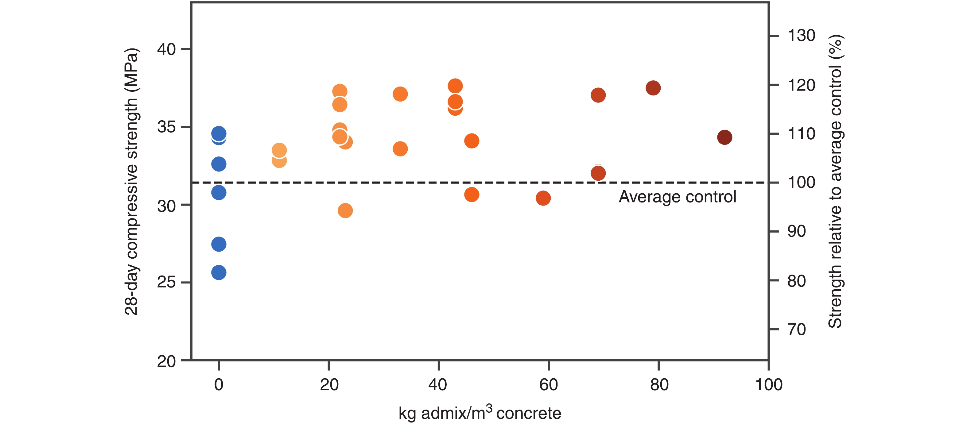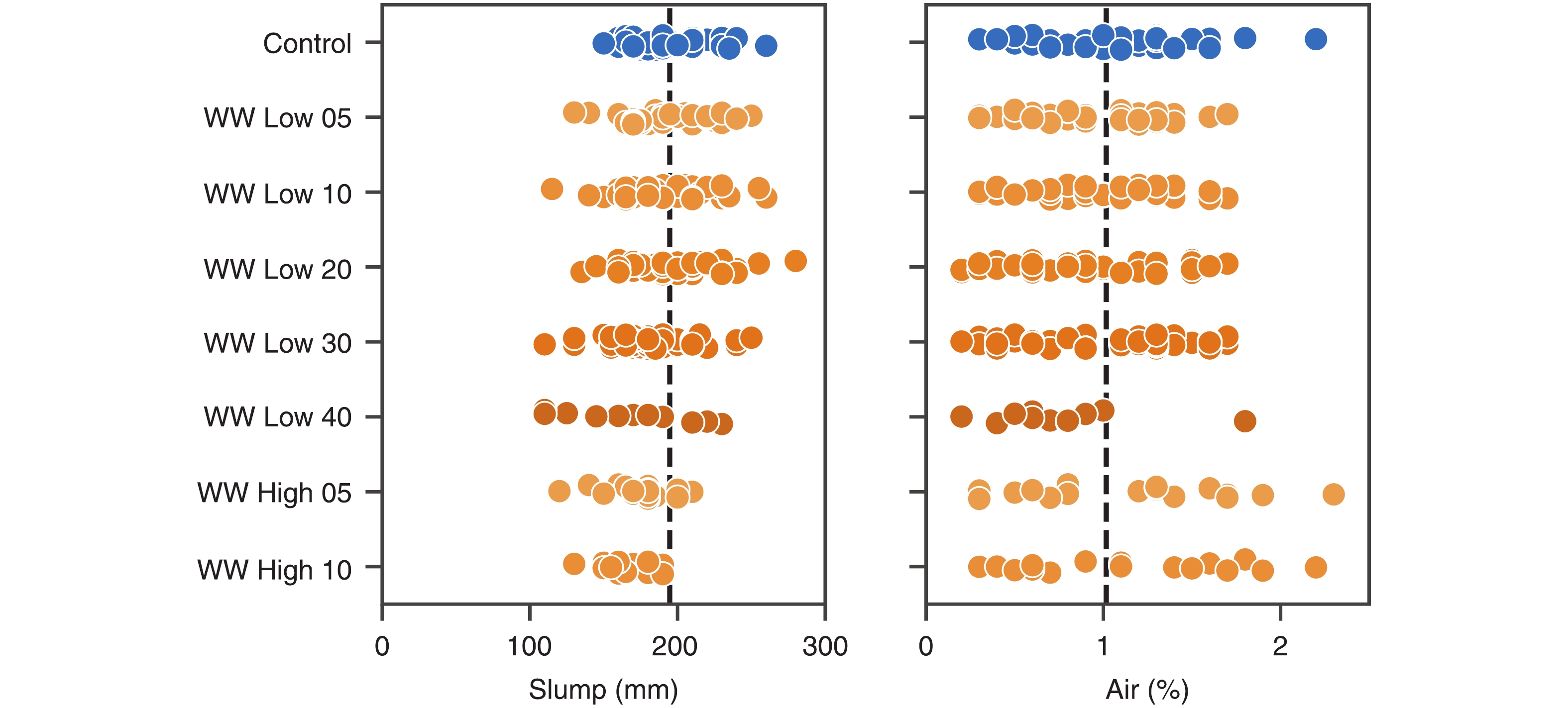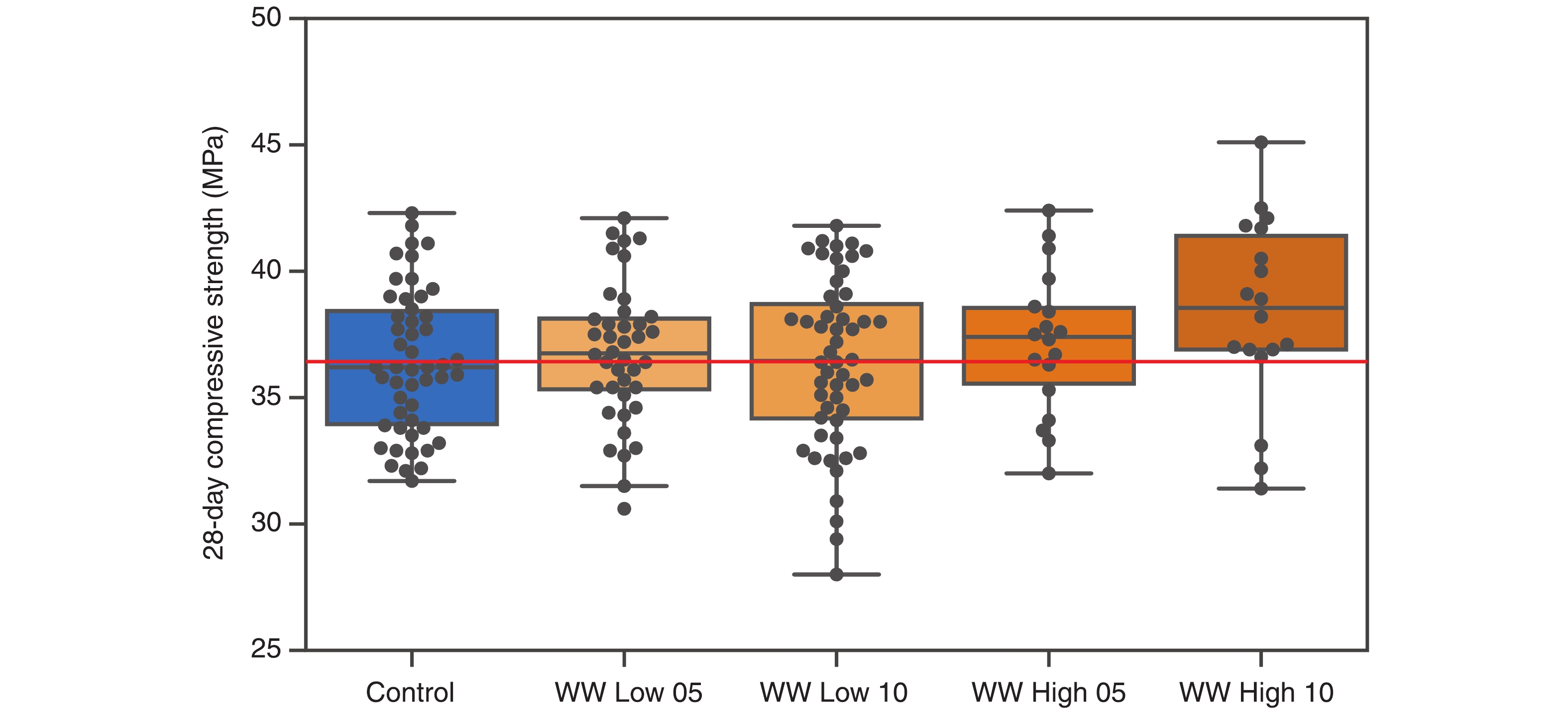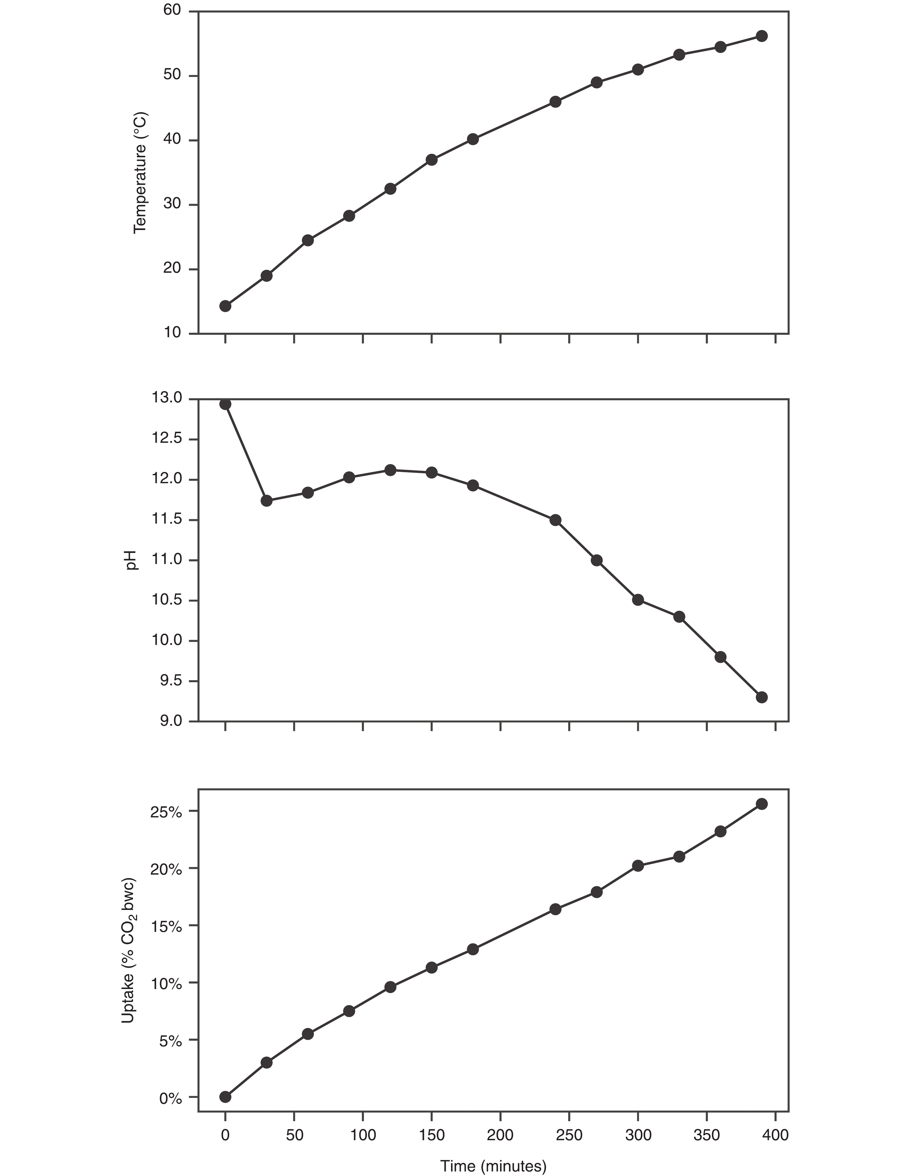 清洗水是作为预拌混凝土生产过程中的废物流而产生的。在实践中,在与这种水的化学过程和性质相关的不利材料性能的影响下,清洗水作为混合水的再利用受到了限制;随着悬浮物含量的增加和时间的延长,这种影响将会加剧。然而,如果可以降低其变化性,则可利用悬浮固体的胶凝特性,将这种废料用作混凝土的有益添加剂。稳定这种材料的一种方法是运用CO2处理,添加的CO2通过与水泥颗粒中的钙发生反应而矿化,形成了一种碳酸钙涂层,防止水泥进一步水合,使材料变得稳定可测。这种方法已被证明可以缓解设定加速度和抗压强度不一致的问题。作为NRG COSIA Carbon XPRIZE参赛项目的一部分,一种CO2处理方法在阿尔伯塔省卡尔加里(Calgary, Alberta)的某一场地中进行了测试。用于处理的浆液由当地混凝土厂提供,密度为1.15。每次处理的模拟清洗水用量为1000 L,平均矿化40 kg CO2。该系统运行1600 h经历了127个处理循环,一共转化了14.5 t CO2,平均矿化效率为80%。处理后的浆液作为添加剂可用于300个批次以上混凝土,使混凝土满足新特性和凝结时间的必要要求,同时获得了其强度效益。用处理过的浆液代替5%和10%的配料水(9.4和18.8 kg浆液/m3混凝土),与参考值相比,强度效益分别为3%和6%。该技术于2021年4月被选为NRG COSIA Carbon XPRIZE大赛(分组B:天然气)的优胜项目。
