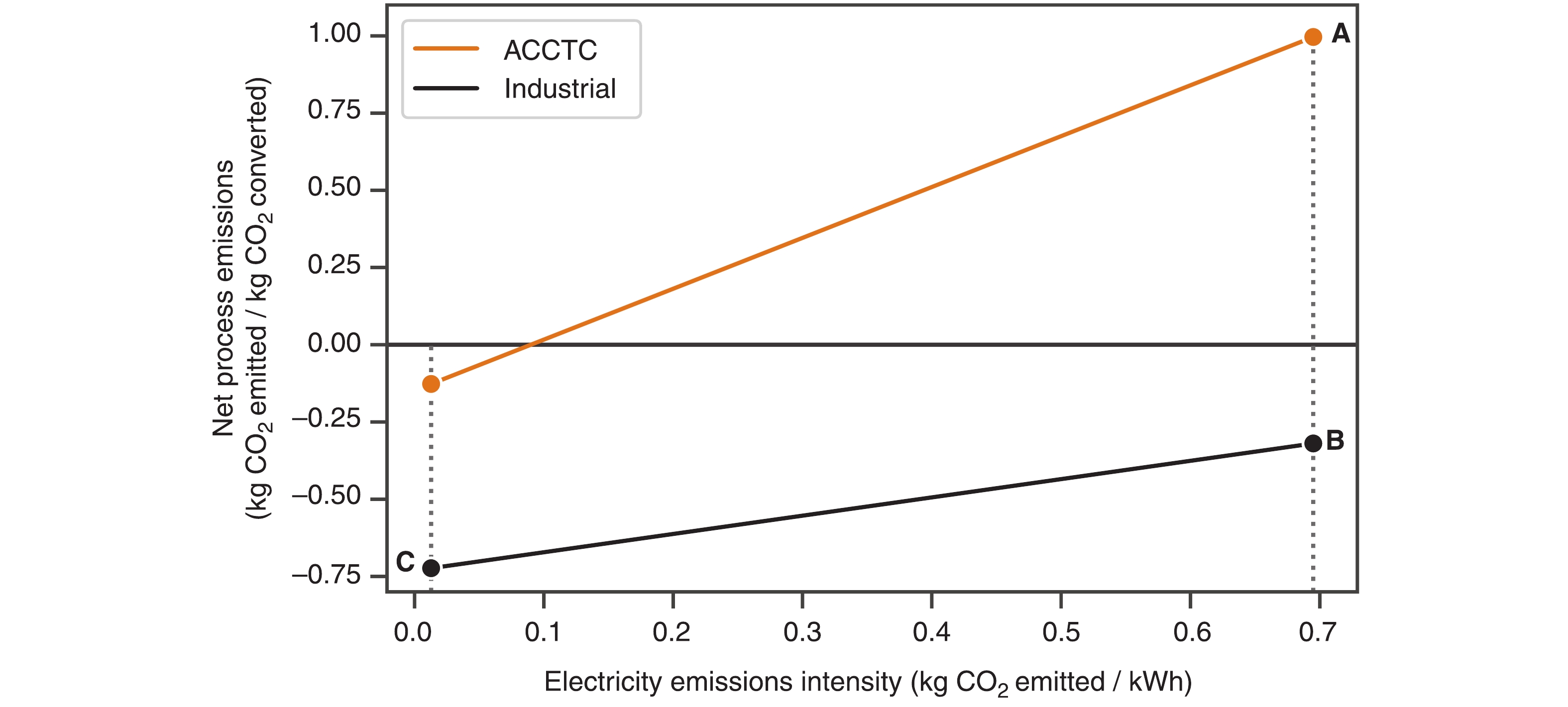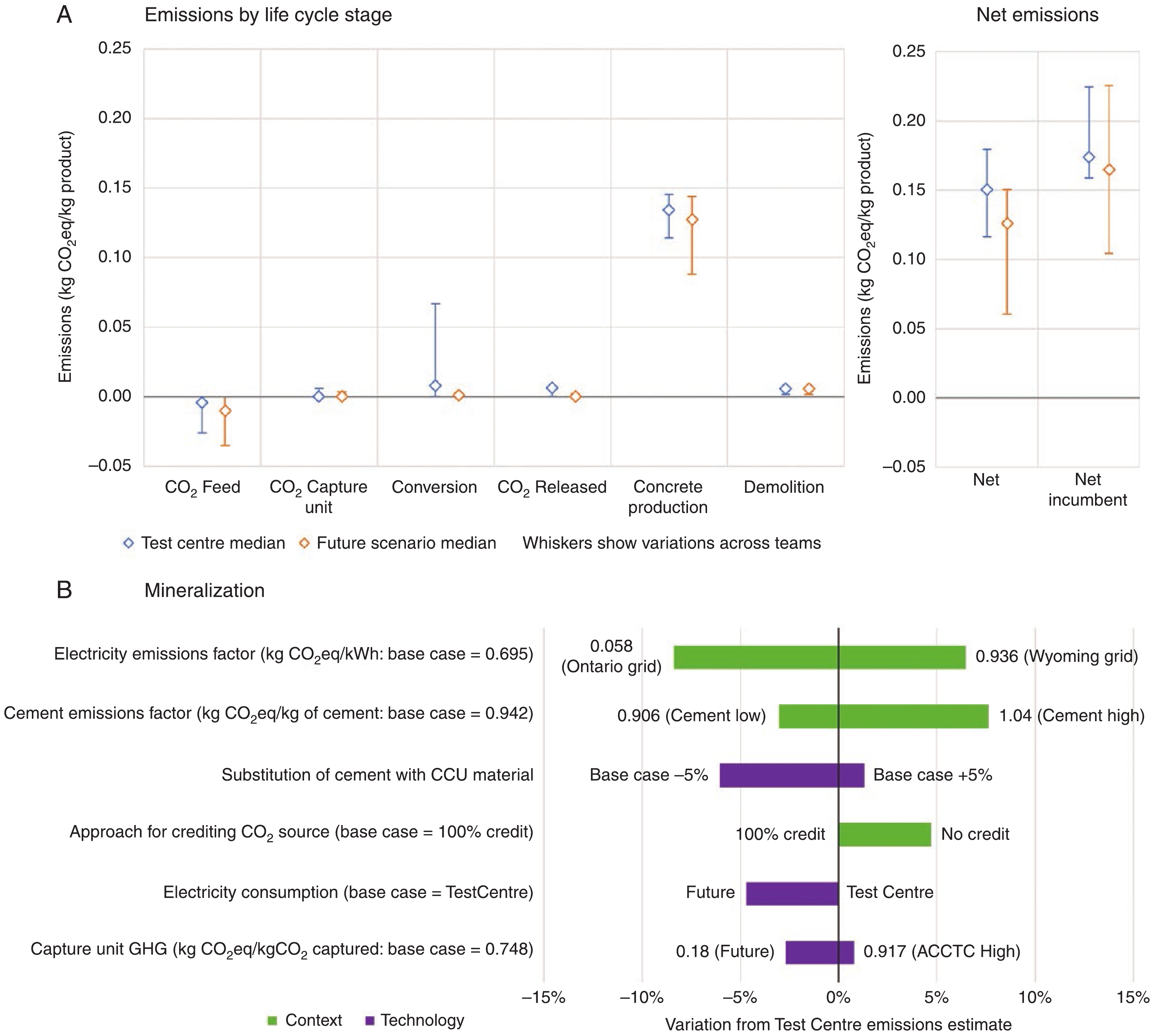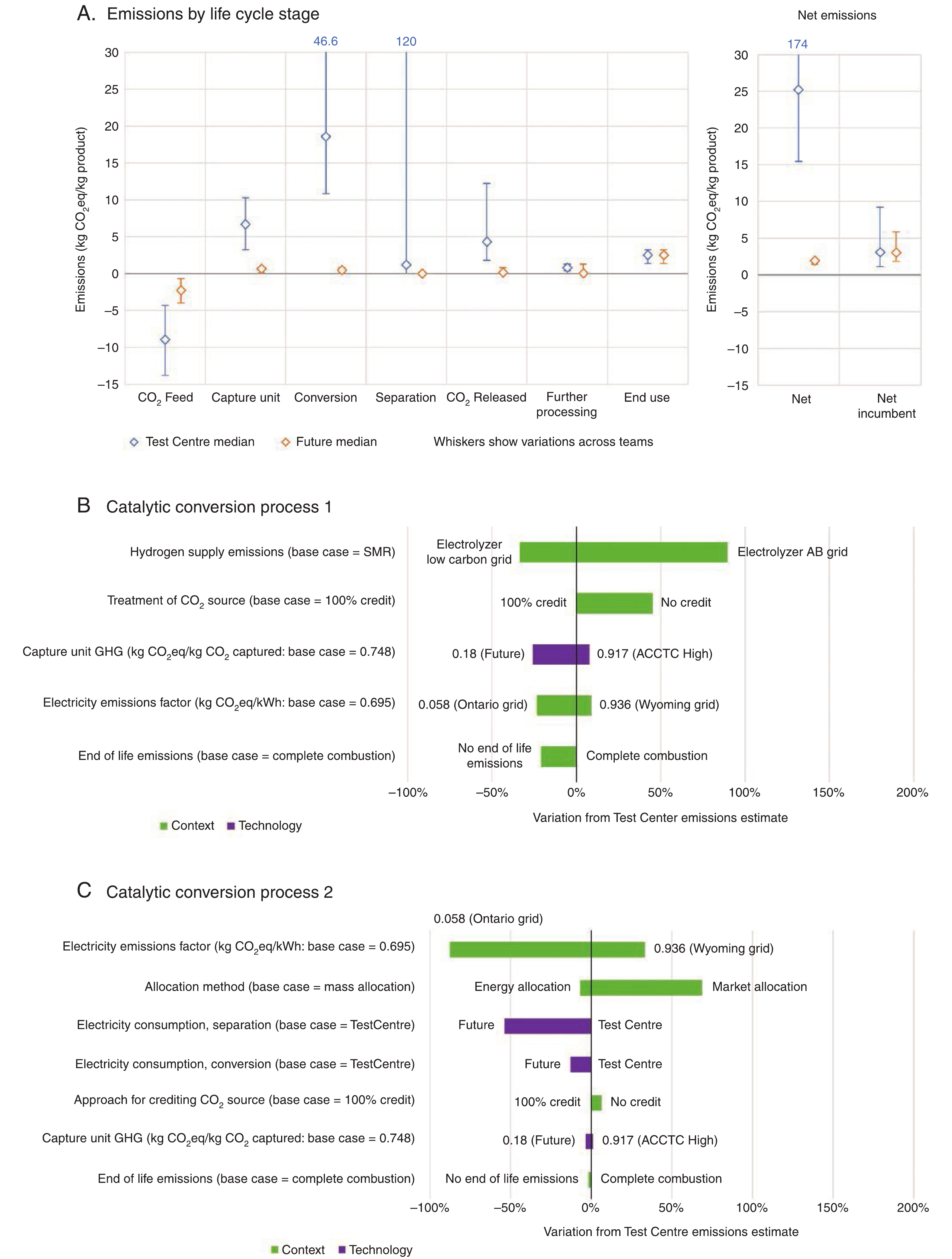 早期阶段技术的生命周期评估(life cycle assessments,LCA)有助于为排放的决定因素提供有价值的洞见,也有助于推进减排机会的优先研究。尽管LCA评估具有上述潜在价值,我们仍需进一步研究LCA以处理不断攀升的不确定性、数据缺口及早期数据的保密性问题。本研究讨论了NRG COSIA Carbon XPRIZE决赛中参赛技术的生命周期碳足迹。NRG COSIA Carbon XPRIZE竞赛奖金高达2000万美元,要求参赛团队使用统一的部署条件、边界及假设方法,并以小型工业试验的规模演示如何将二氧化碳转化为有价值的产品。该竞赛使我们能够在评估不同早期技术的同时探索LCA的使用及改进。本文共评估了两种转化途径的碳排放强度:(i)二氧化碳矿化及(ii)二氧化碳催化转化(涵盖热化学、电化学、光催化及混合过程)。本文对各参赛团队的数据进行了汇总,重点标出了试点中各工业生命周期阶段所展示的排放强度范围。此外,本文还展望了未来,演示了可使参赛团队相较于现有流程能够避免碳排放的渐进性技术与部署条件(即相对于可比产品的参考生产途径的碳排放更少)。最后,本文对不同团队、不同转化途径及产品进行了评估,并从生命周期的角度概括了下一个部署阶段碳捕捉与利用技术将要面临的机遇及挑战。