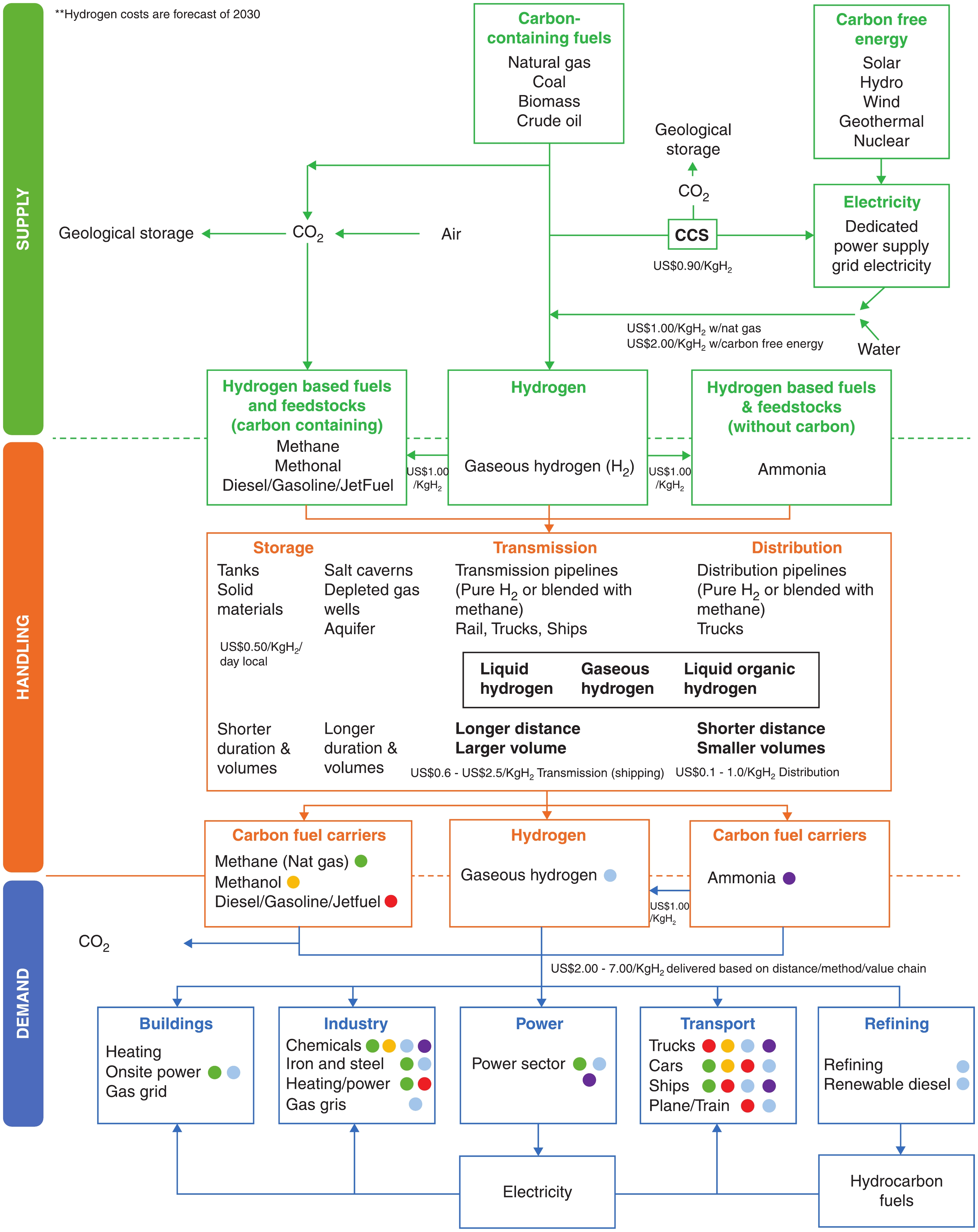 一个政府间气候变化小组在2018年得出了如下结论:为使全球温度上升不超过1.5 ℃,必须要在2050年前实现温室气体的净零排放。自此已有超过110个国家承诺于2050年前实现碳中和目标,并在国家层面上将氢能确定为实现这一目标的关键。多国政府已承诺投入超过700亿美元进一步推进氢能基础设施与技术的建设和发展,并研究已提出的200多个氢能项目(预计2030年之前完成),投资总额达到了3000亿美元。这些宏伟目标的实现离不开各项战略的紧密配合,从而发展出一套一体化的宏观基础设施系统。本文阐述了目前正处于起步阶段的氢能市场,介绍和定义了一种基于由Mintzberg和Waters提出的应急战略概念的新“协同应急战略”,并通过一种分阶段的微观–介观–宏观架构将这一战略的发展可行性联系了起来。本文还综述了竞争市场先发优势的成功战略性商业案例和当前的跨行业市场机会。