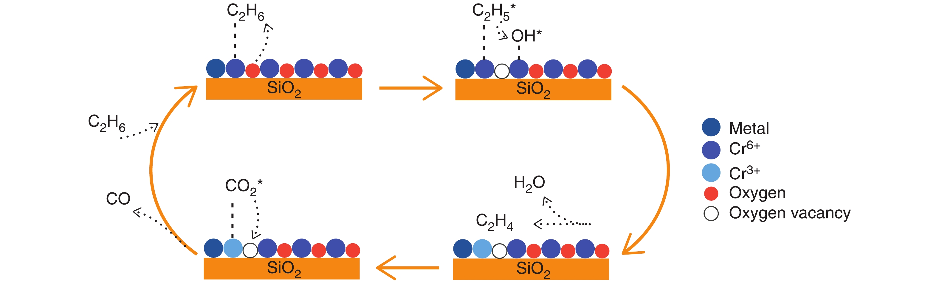 CO2可作为低碳烷烃氧化脱氢(CO2-ODH)的弱氧化剂,有利于实现CO2的再利用,满足对烯烃的需求。该反应的核心是催化剂。因为Cr基催化剂具有不同的氧化态和局域电子结构,所以在CO2-ODH反应中具有优异的催化性能,并且备受关注。本文总结了用于CO2-ODH的Cr基催化剂的合成及改性方法,还总结了催化剂的构效关系和反应机理。此外,本文还分析了Cr基催化剂失活的原因,讨论了Cr基催化剂在CO2-ODH工艺中面临的主要挑战,以及未来的发展趋势和前景。