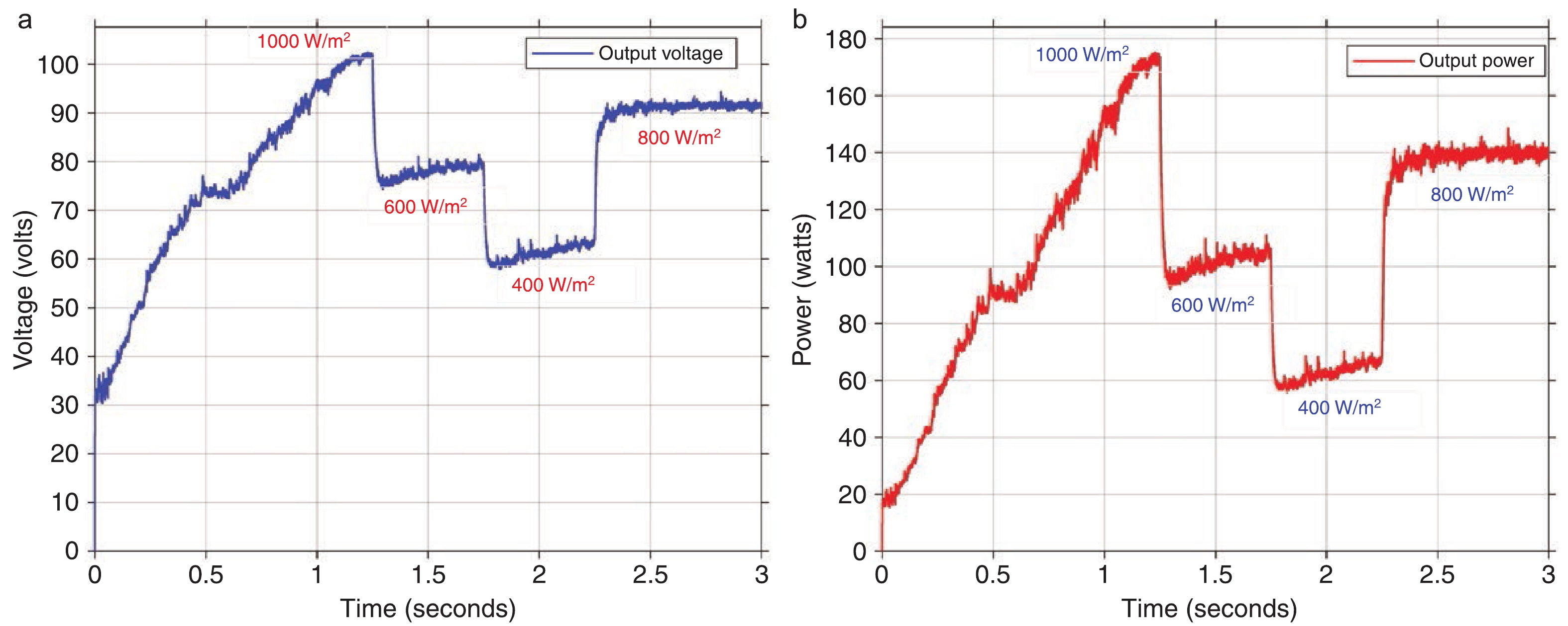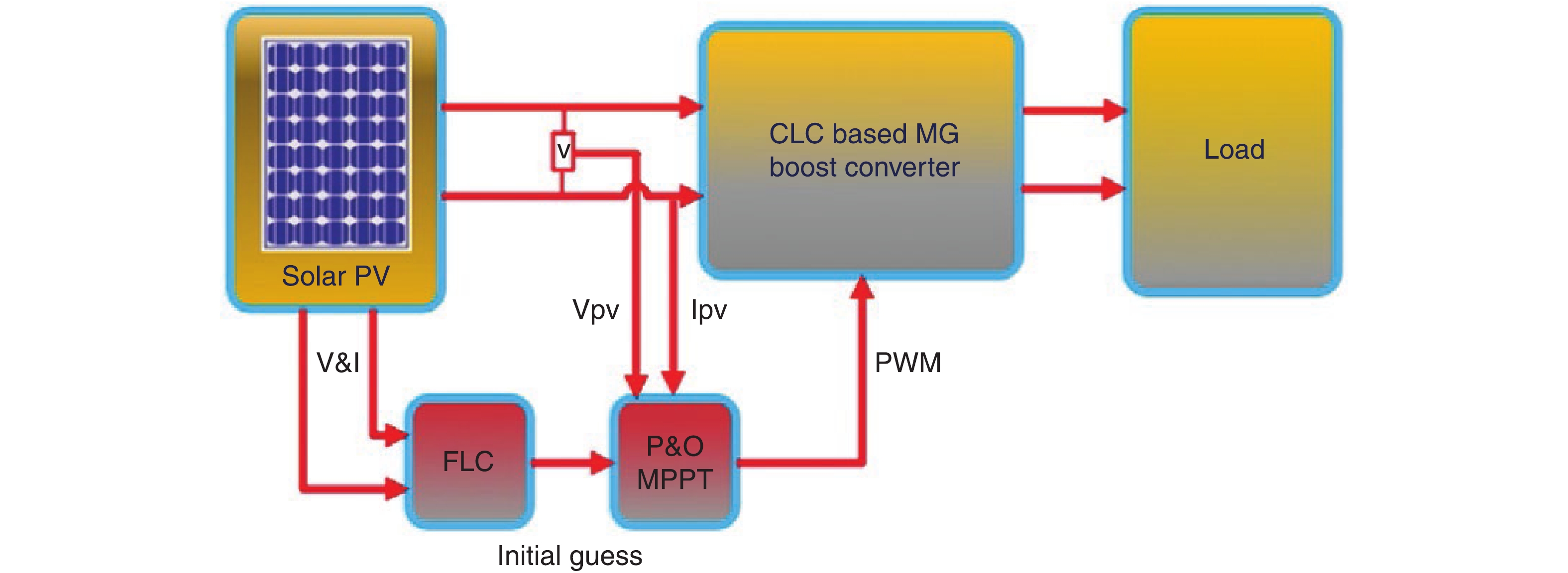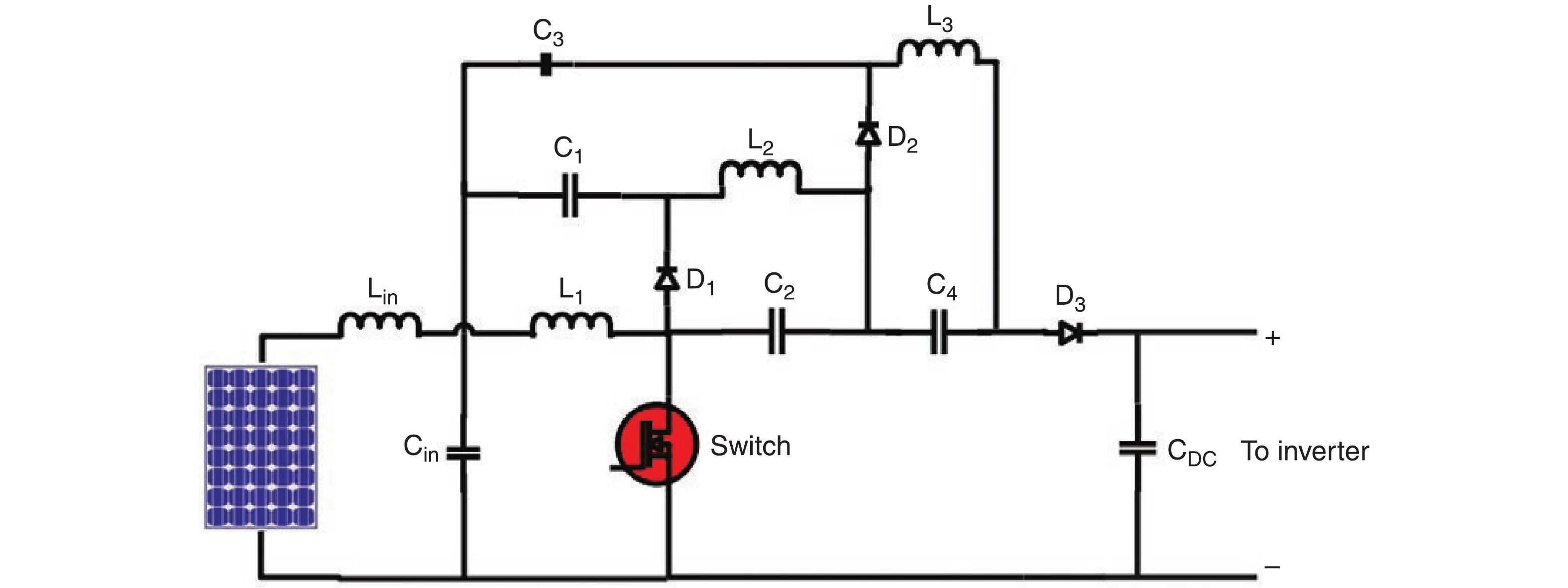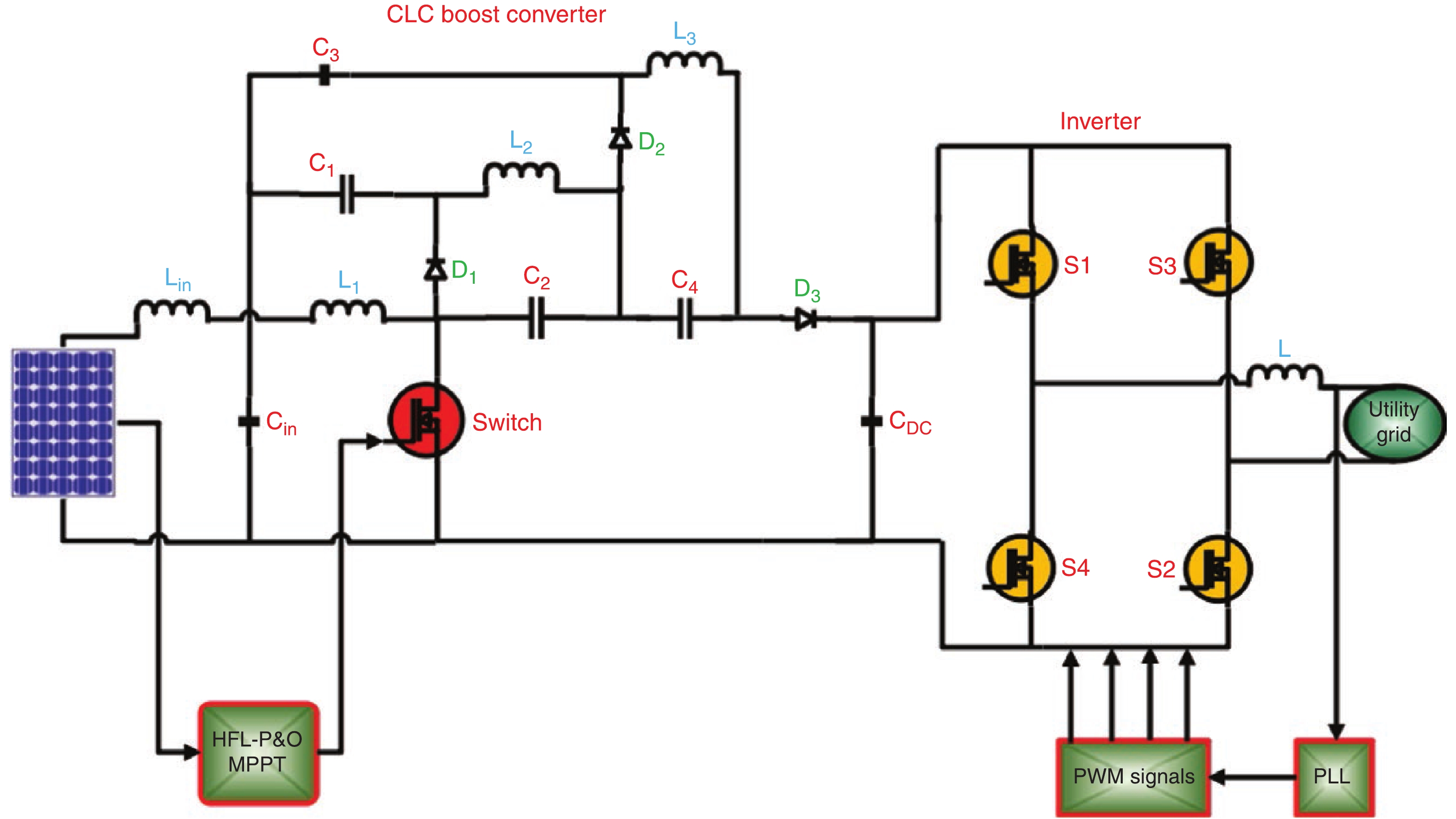 本文分析了用于太阳能光伏(SPV)并网逆变器发电系统的高增益升压变换器(MGBC)的性能。基于电容电感电容(CLC)的MGBC可将SPV系统输出电压提升至所需水平。升压变换器(BC)的升压幅度/升压水平由CLC芯数决定。本文比较了建议MGBC与各种传统BC的升压因数及元件个数,从而提出了一种混合模糊逻辑-扰动观察最大功率点跟踪器(HFL-P&O MPPT),该HFL-P&O MPPT可用于监测SPV系统的Pmax(最大功率)。此外,本文还比较分析了建议MPPT与传统P&O及基于模糊逻辑(FLB)的MPPT在基于CLC的MGBC上的应用,包括升压时间、电压纹波率(%)、稳态时间及升压因数。本文用MATLAB/Simulink工具分析了开发模型在不同辐照度下的输出特征。MPPT仿真结果表明MPP振荡最小时建议MPPT 0.015 s的升压时间明显优于传统MPPT及FLB-MPPT。建议CLC-MGBC升压因数颇高,为4。由传统逆变器将SPV功率注入电网,再用锁相环系统进行同步切换。逆变器输出电流的总谐波失真为1.66%,在IEEE标准容许范围内。
