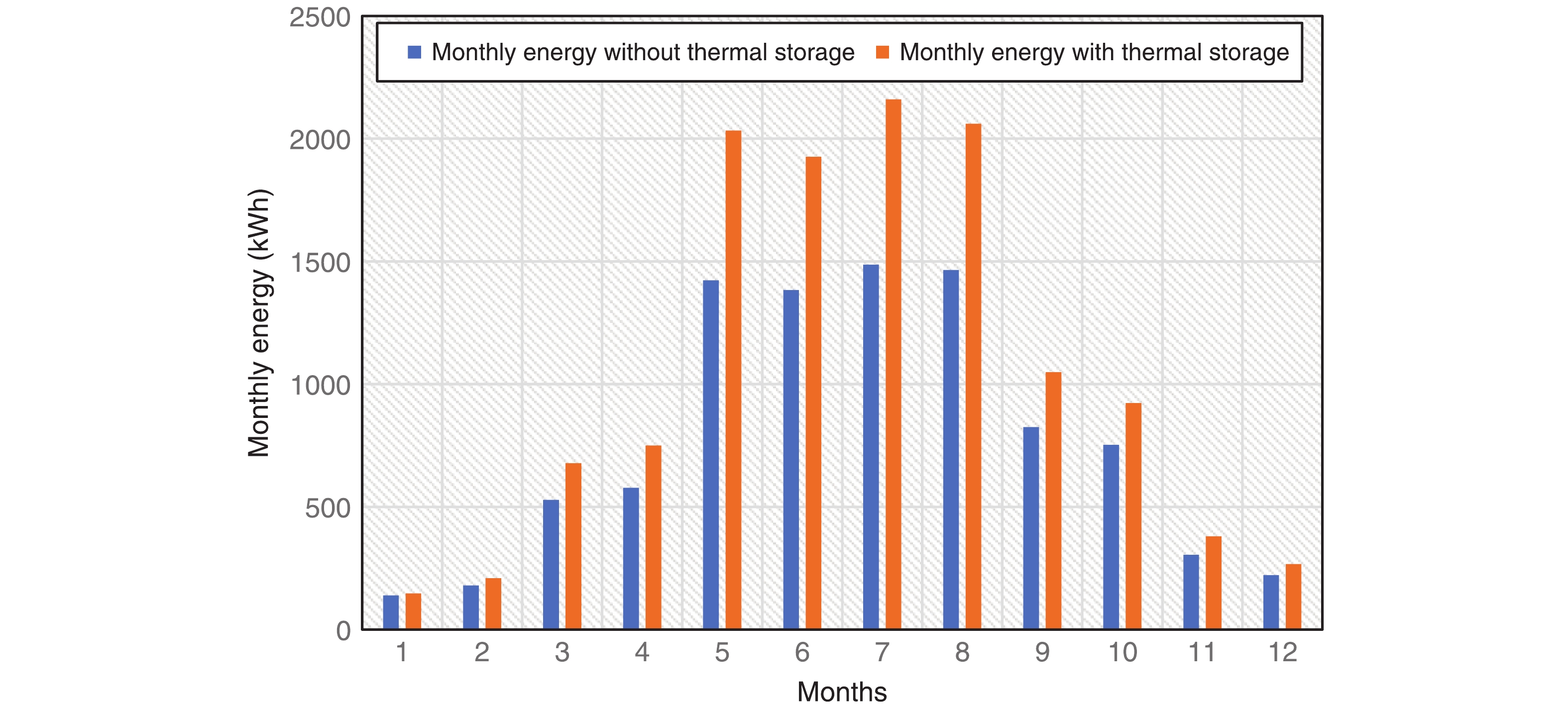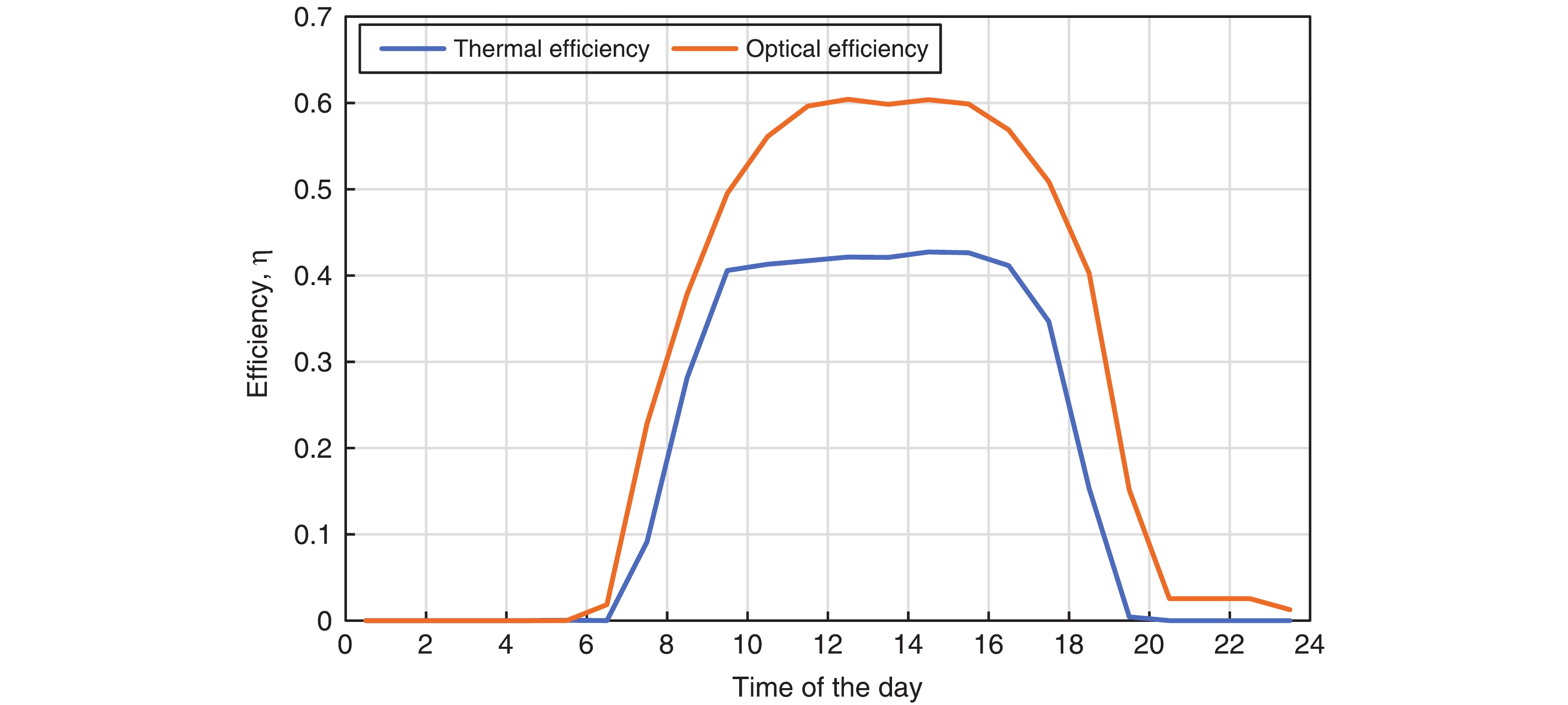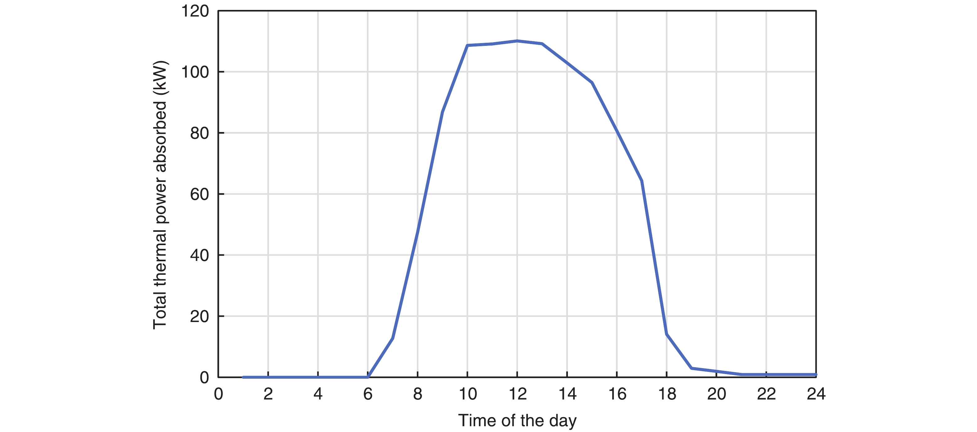 有机朗肯循环(ORC)可与线性菲涅耳反射器(LFR)耦合用于利用低品位热源。本文介绍了在西班牙阿尔马特雷特(Almatret, Spain)气候条件下对小型LFR-ORC发电系统的研究工作。文中利用热力学方程建立了数学模型,并进行了仿真模拟,用以对LFR系统的光学性能和ORC系统的热学性能进行评价。在太阳能镜场中使用的传热流体(HTF)为Therminol-62,而在ORC发电系统中的工质则是NOVECTM 649。该LFR系统集成了配备双罐系统的蓄热装置单元,并通过换热器存储太阳辐射热能。在下午1:00的日间峰值运行时段中,LFR系统集热器的输出热量为108 kW,热损失为7.872 kW。在特定设计工况下,ORC透平的机械输出功率为7.296 kW,双罐蓄热系统可在日落后为发电站增加4 h的运行时间。