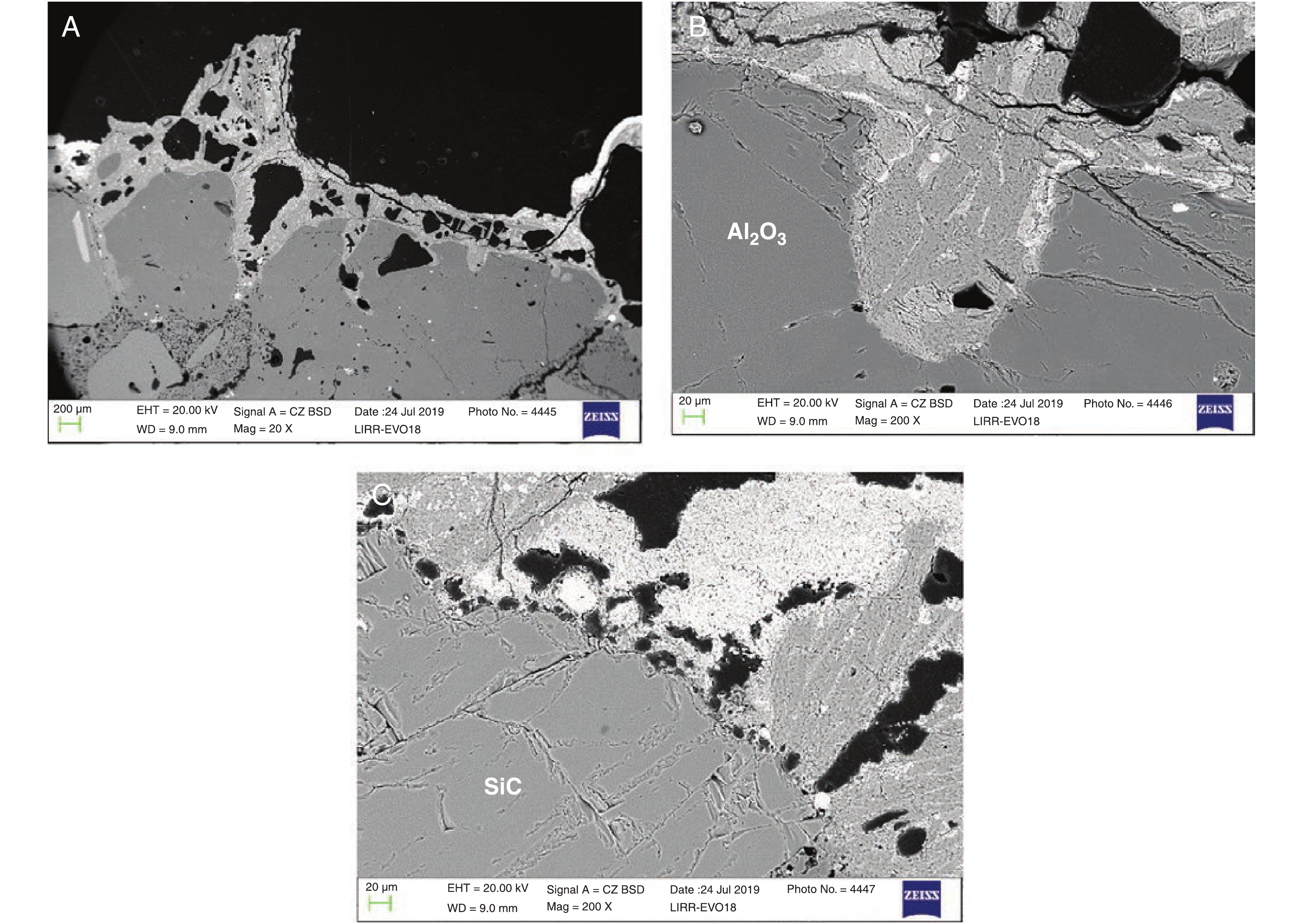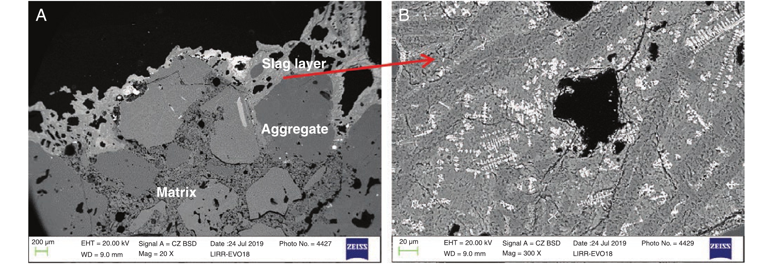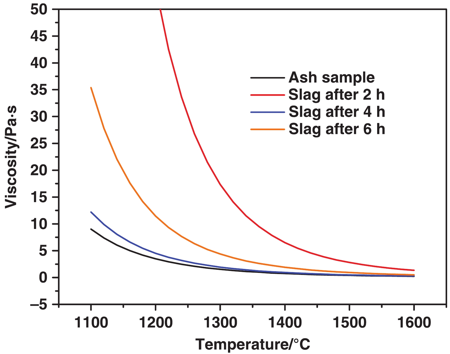煤直接液化残渣萃余物(以下简称萃余物) 作为气化原料有重要的经济价值。然而,萃余物高灰高铁的特性不仅增加了对耐火材料侵蚀的风险,还会影响气化炉的长周期稳定运行。本工作采用回转抗渣炉在模拟气化气氛条件下开展了煤掺混萃余物(质量百分含量为80%的煤和20%的萃余物)煤灰熔渣对高铬耐火砖和碳化硅 (SiC) 的侵蚀实验。实验结果表明,在相同温度下,侵蚀后倒出渣的黏度要高于初始灰样的黏度,该结果表明,为确保气化炉顺利排渣,建议以倒出渣的黏温关系作为确定气化操作窗口熔渣的参考。对于高铬耐火砖,熔渣中的铁氧化物会与耐火砖基质中的三氧化二铬 (Cr2O3) 发生反应;由于未发现骨料被破坏的情况,因此熔渣对耐火砖基质结构的破坏是造成高铬耐火砖侵蚀的关键因素。在裸露的碳化硅砖中发现了单质铁的存在,这表明熔渣中的铁氧化物与碳化硅发生反应生成了单质铁和二氧化硅 (SiO2)。熔渣对碳化硅砖的侵蚀主要取决于氧化铝 (Al2O3) 颗粒的溶解,以及熔渣中的铁氧化物与碳化硅颗粒之间的反应。因此,煤灰中较高的铁含量对耐火材料的侵蚀有重要影响,对于在煤中掺混萃余物用作气化工艺原料来说,将来还需要开展更多的研究工作。