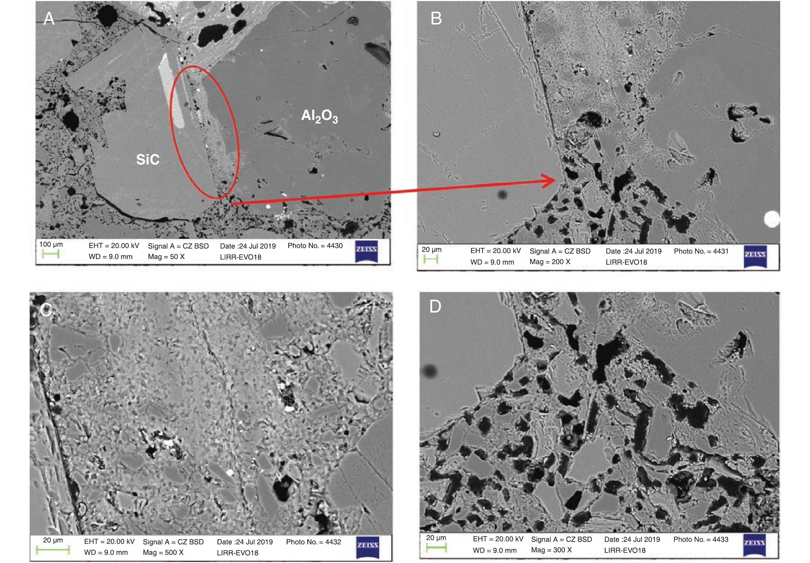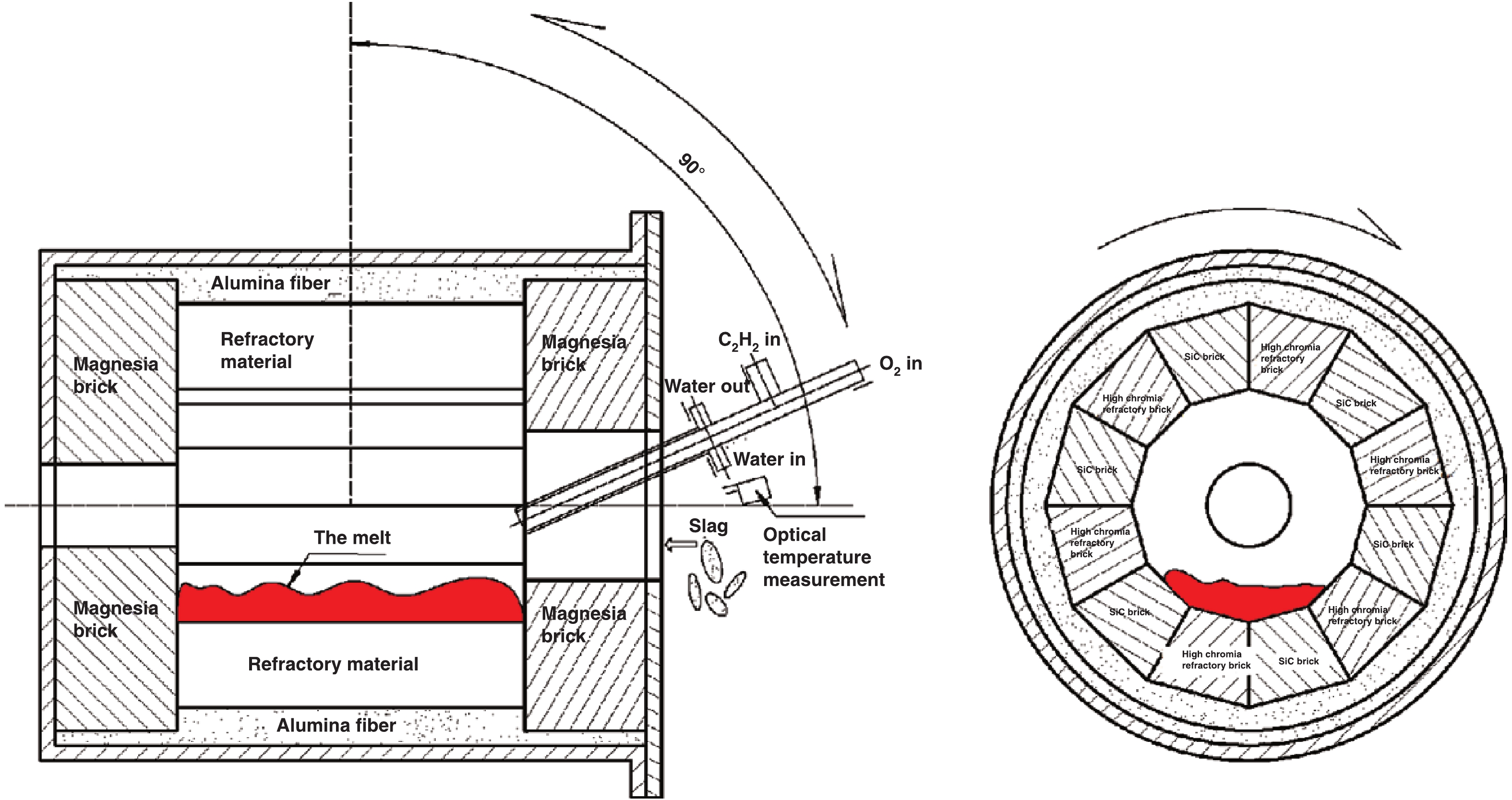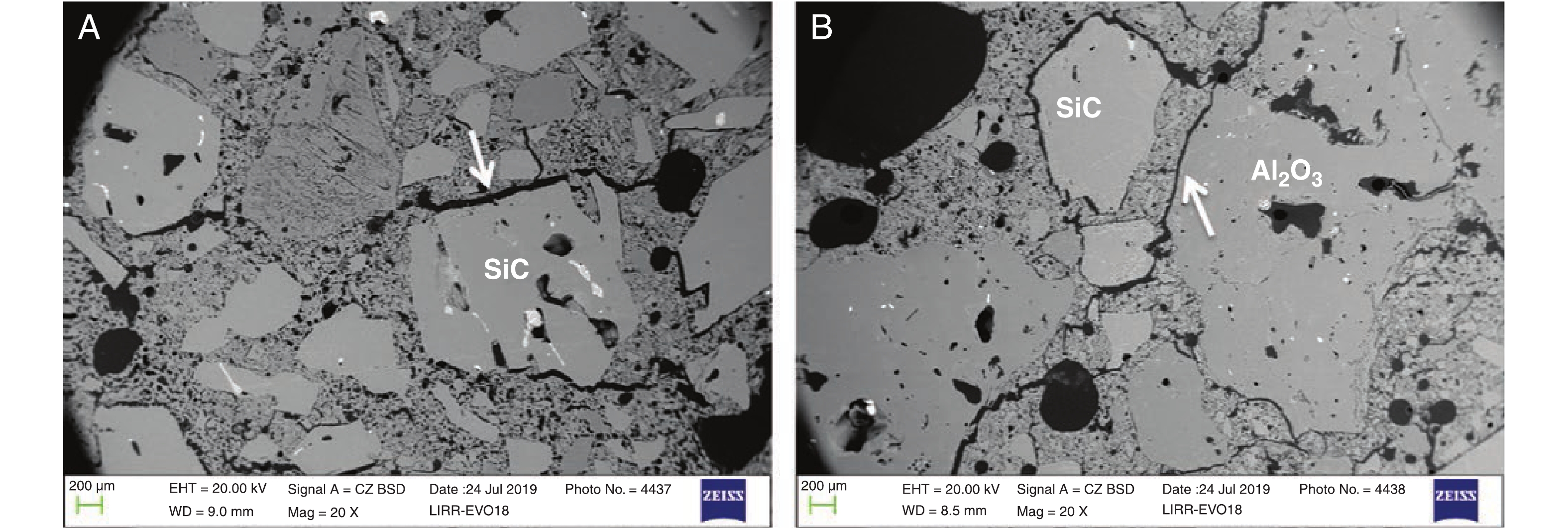 煤直接液化残渣萃余物(以下简称萃余物) 作为气化原料有重要的经济价值。然而,萃余物高灰高铁的特性不仅增加了对耐火材料侵蚀的风险,还会影响气化炉的长周期稳定运行。本工作采用回转抗渣炉在模拟气化气氛条件下开展了煤掺混萃余物(质量百分含量为80%的煤和20%的萃余物)煤灰熔渣对高铬耐火砖和碳化硅 (SiC) 的侵蚀实验。实验结果表明,在相同温度下,侵蚀后倒出渣的黏度要高于初始灰样的黏度,该结果表明,为确保气化炉顺利排渣,建议以倒出渣的黏温关系作为确定气化操作窗口熔渣的参考。对于高铬耐火砖,熔渣中的铁氧化物会与耐火砖基质中的三氧化二铬 (Cr2O3) 发生反应;由于未发现骨料被破坏的情况,因此熔渣对耐火砖基质结构的破坏是造成高铬耐火砖侵蚀的关键因素。在裸露的碳化硅砖中发现了单质铁的存在,这表明熔渣中的铁氧化物与碳化硅发生反应生成了单质铁和二氧化硅 (SiO2)。熔渣对碳化硅砖的侵蚀主要取决于氧化铝 (Al2O3) 颗粒的溶解,以及熔渣中的铁氧化物与碳化硅颗粒之间的反应。因此,煤灰中较高的铁含量对耐火材料的侵蚀有重要影响,对于在煤中掺混萃余物用作气化工艺原料来说,将来还需要开展更多的研究工作。