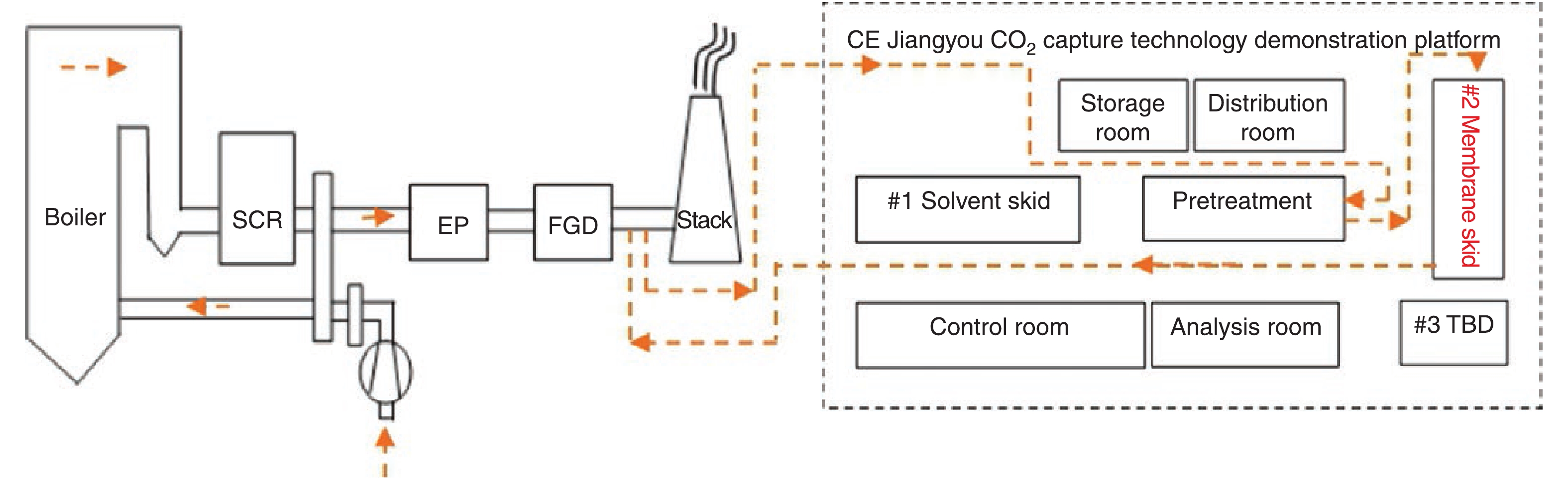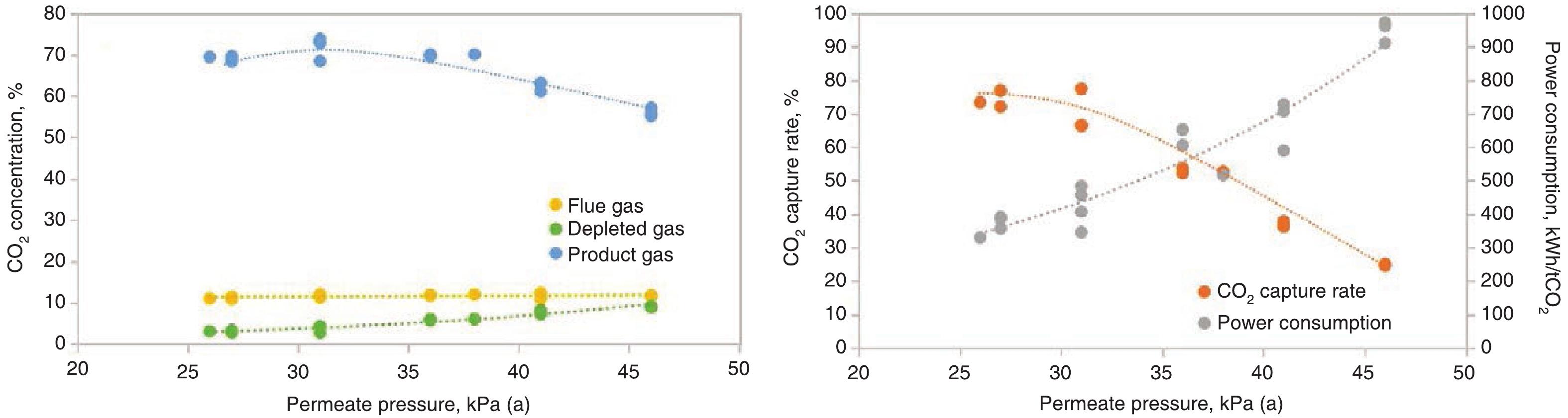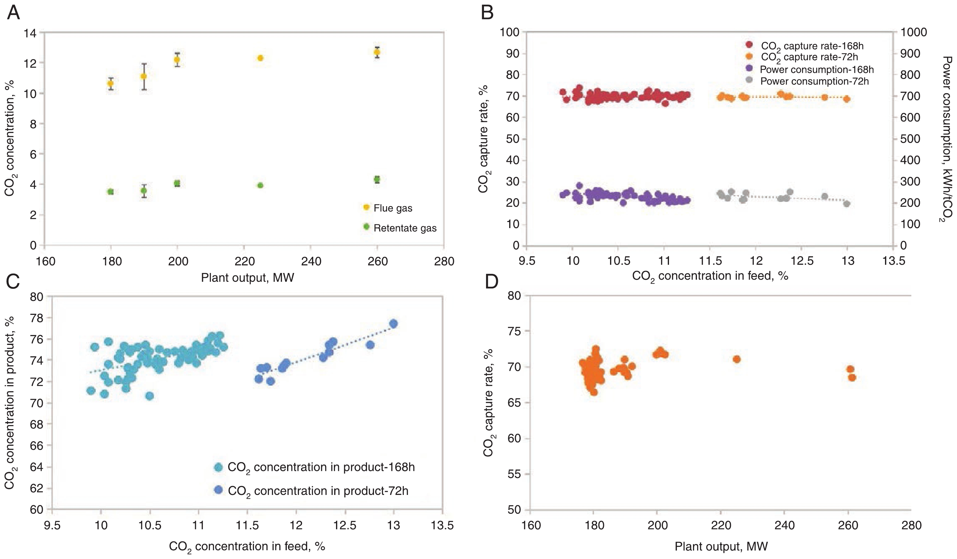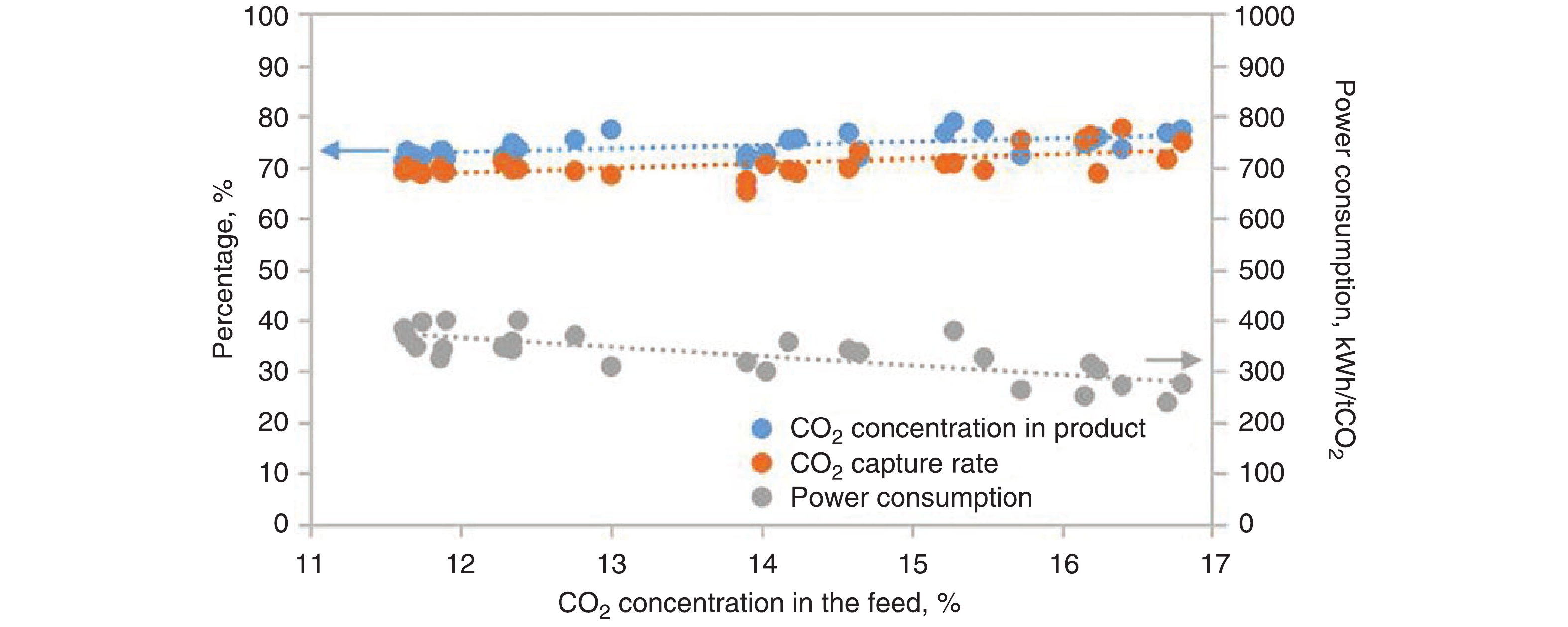相比于传统溶剂法,膜分离技术通过减少能量消耗和投资成本,有望进一步降低电厂烟气中二氧化碳捕集成本。研究表明控制运行条件即可实现这一目标,但仍需要大量性能数据及可靠现场条件支持。中国燃煤电厂采用动态运行模式,烟气成分随发电量的增减而变化。本文首次现场测试了与中国动态运行电厂相结合的膜法燃烧后二氧化碳捕集系统试点,报道了电厂运行负荷为54%—84%时膜技术研究公司(Membrane Technology Research, Inc.,MTR)PolarisTM膜法二氧化碳捕集系统的性能表现,并进行了长达168 h的运行稳定性测试,测试期间电厂运行负荷高达79%,低至55%,平均运行负荷约为55%。研究结果证实了膜法二氧化碳捕集系统可在各种主电厂运行条件下有效运行,也指出了膜法二氧化碳捕集系统走向商业化时应注意的一些问题,如电厂一体化、系统控制及面对寄主电厂突发状况时的抗干扰能力等。