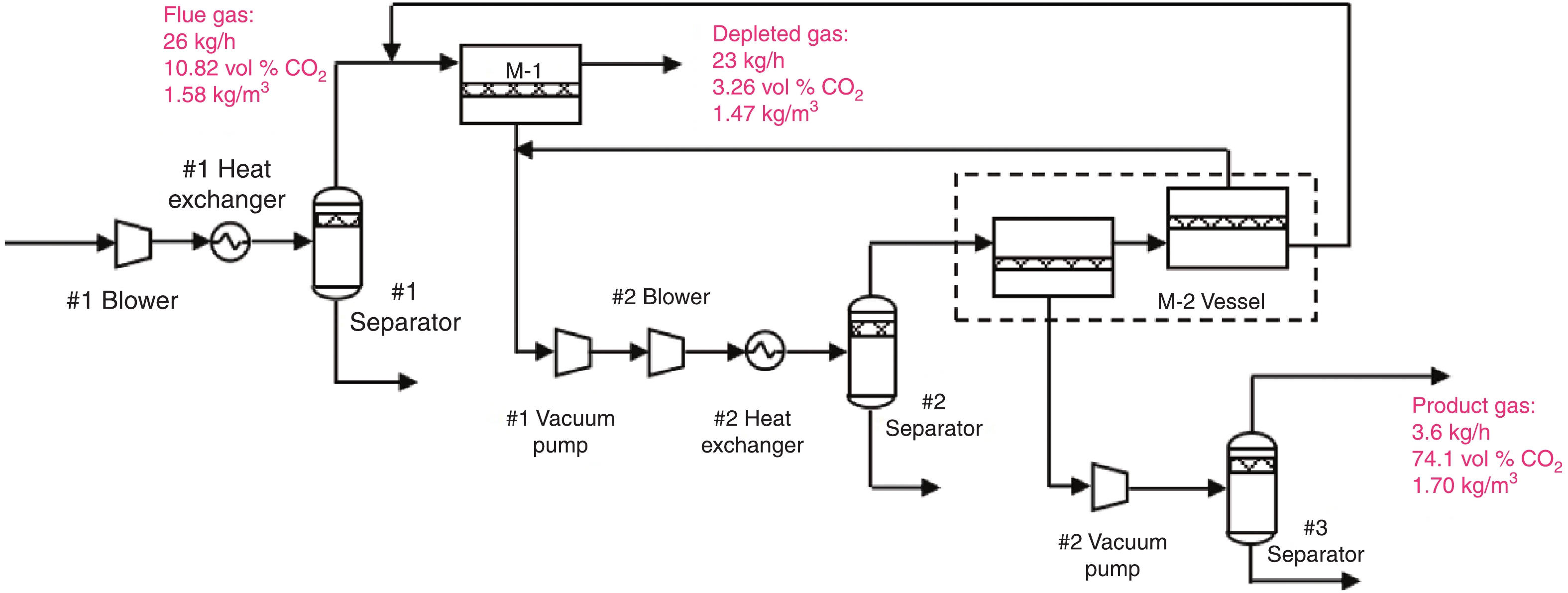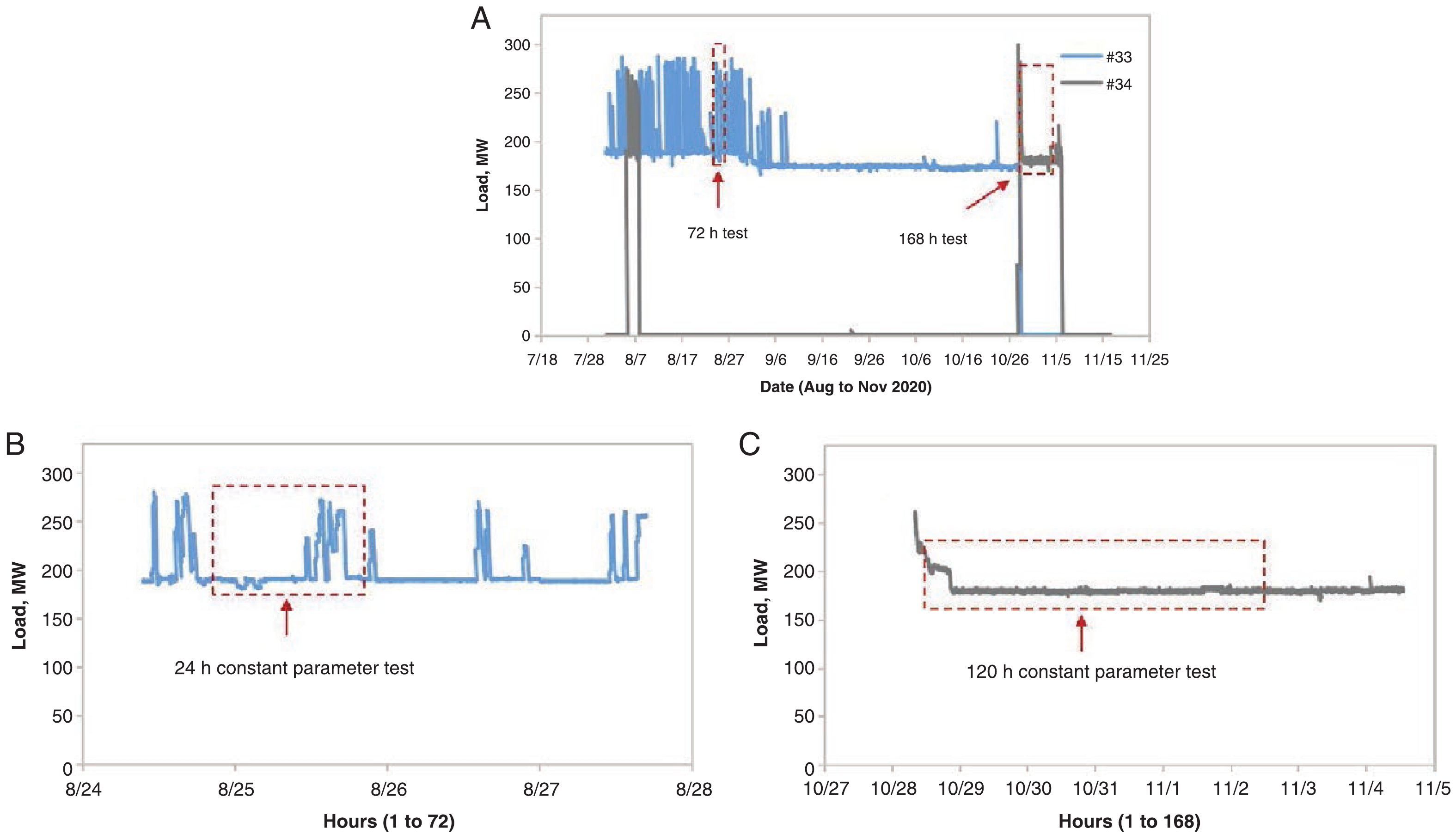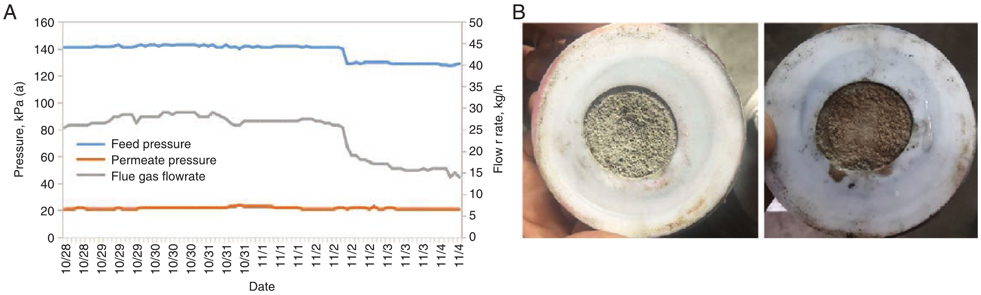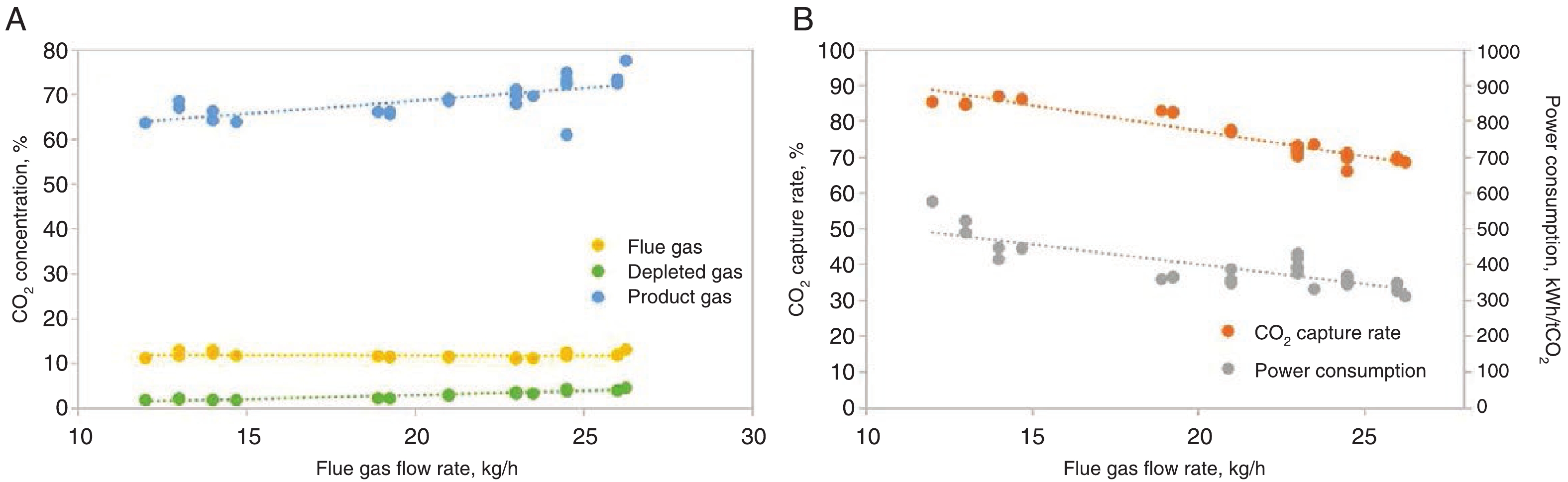 相比于传统溶剂法,膜分离技术通过减少能量消耗和投资成本,有望进一步降低电厂烟气中二氧化碳捕集成本。研究表明控制运行条件即可实现这一目标,但仍需要大量性能数据及可靠现场条件支持。中国燃煤电厂采用动态运行模式,烟气成分随发电量的增减而变化。本文首次现场测试了与中国动态运行电厂相结合的膜法燃烧后二氧化碳捕集系统试点,报道了电厂运行负荷为54%—84%时膜技术研究公司(Membrane Technology Research, Inc.,MTR)PolarisTM膜法二氧化碳捕集系统的性能表现,并进行了长达168 h的运行稳定性测试,测试期间电厂运行负荷高达79%,低至55%,平均运行负荷约为55%。研究结果证实了膜法二氧化碳捕集系统可在各种主电厂运行条件下有效运行,也指出了膜法二氧化碳捕集系统走向商业化时应注意的一些问题,如电厂一体化、系统控制及面对寄主电厂突发状况时的抗干扰能力等。